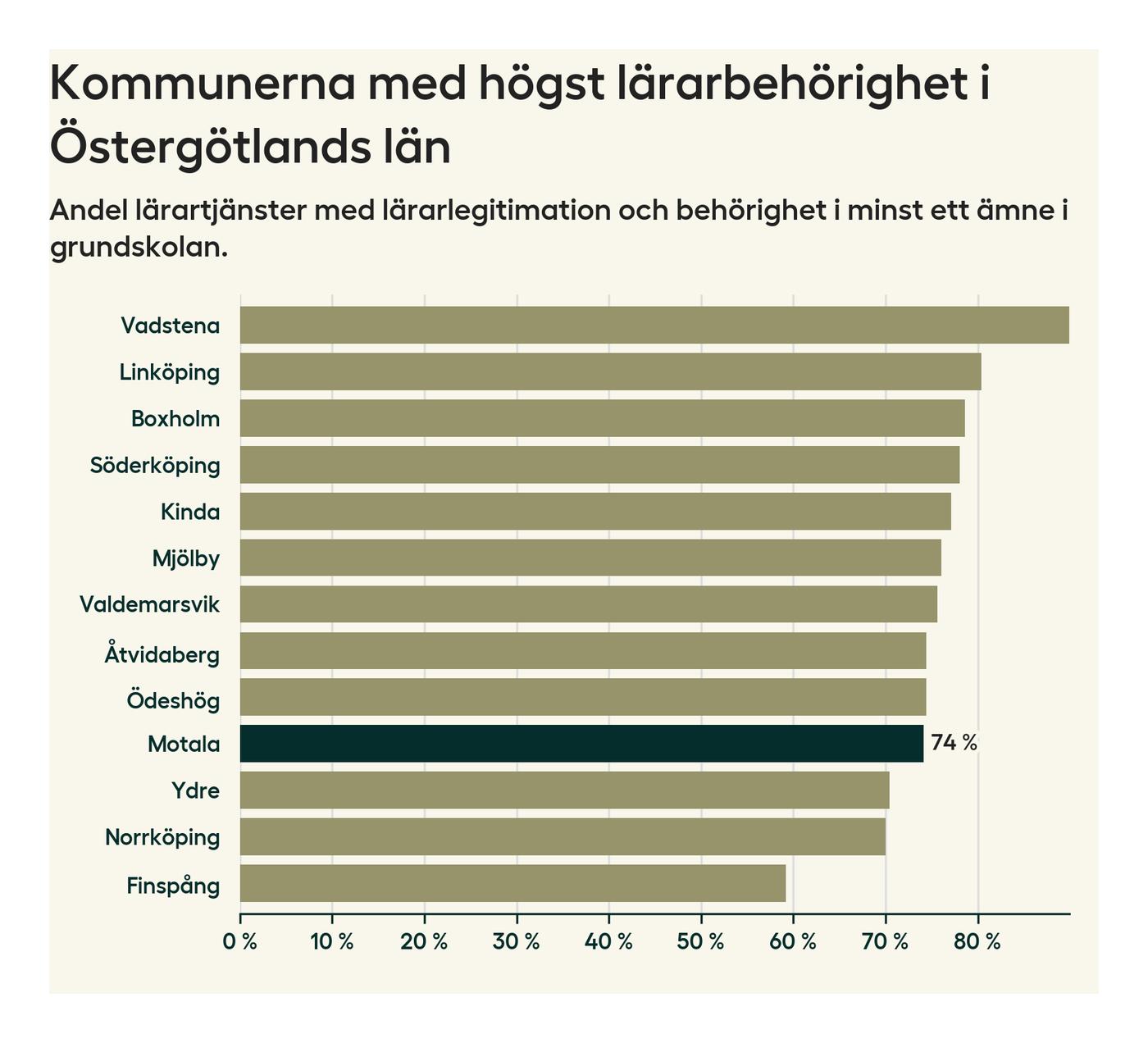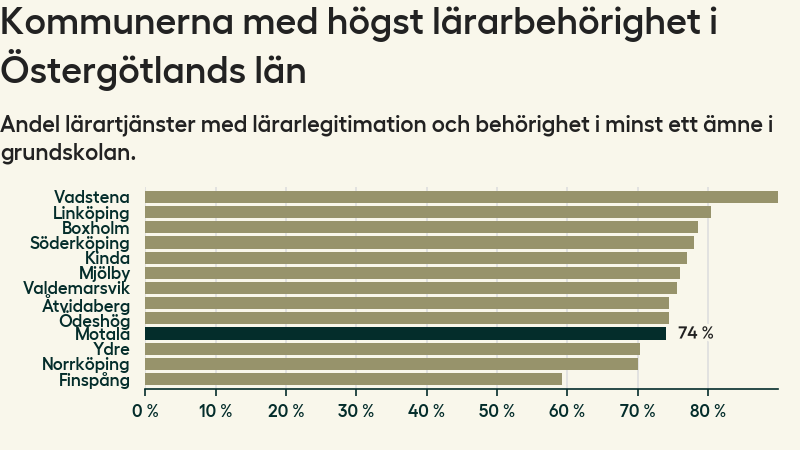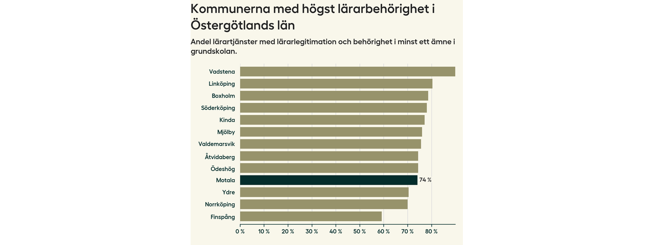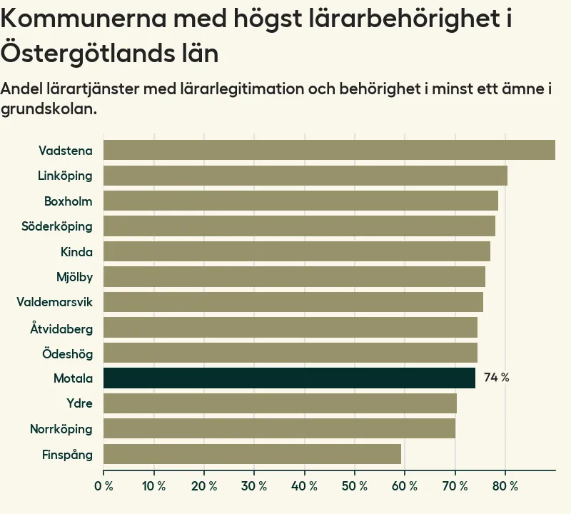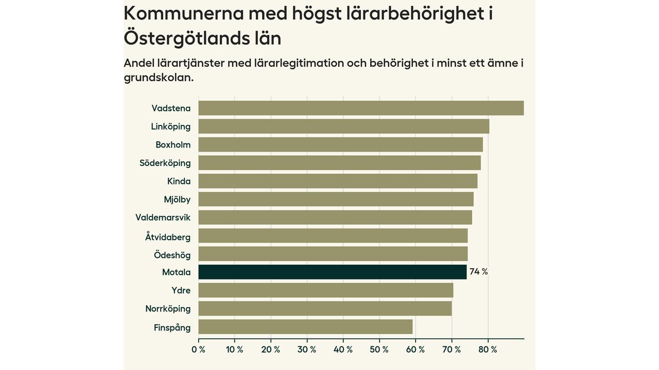 Av de sammanlagt 339 heltidstjänsterna i grundskolan i Motala kommun (motsvarande 390 lärare) var det 251 som hade lärarlegitimation och behörighet i minst ett ämne.