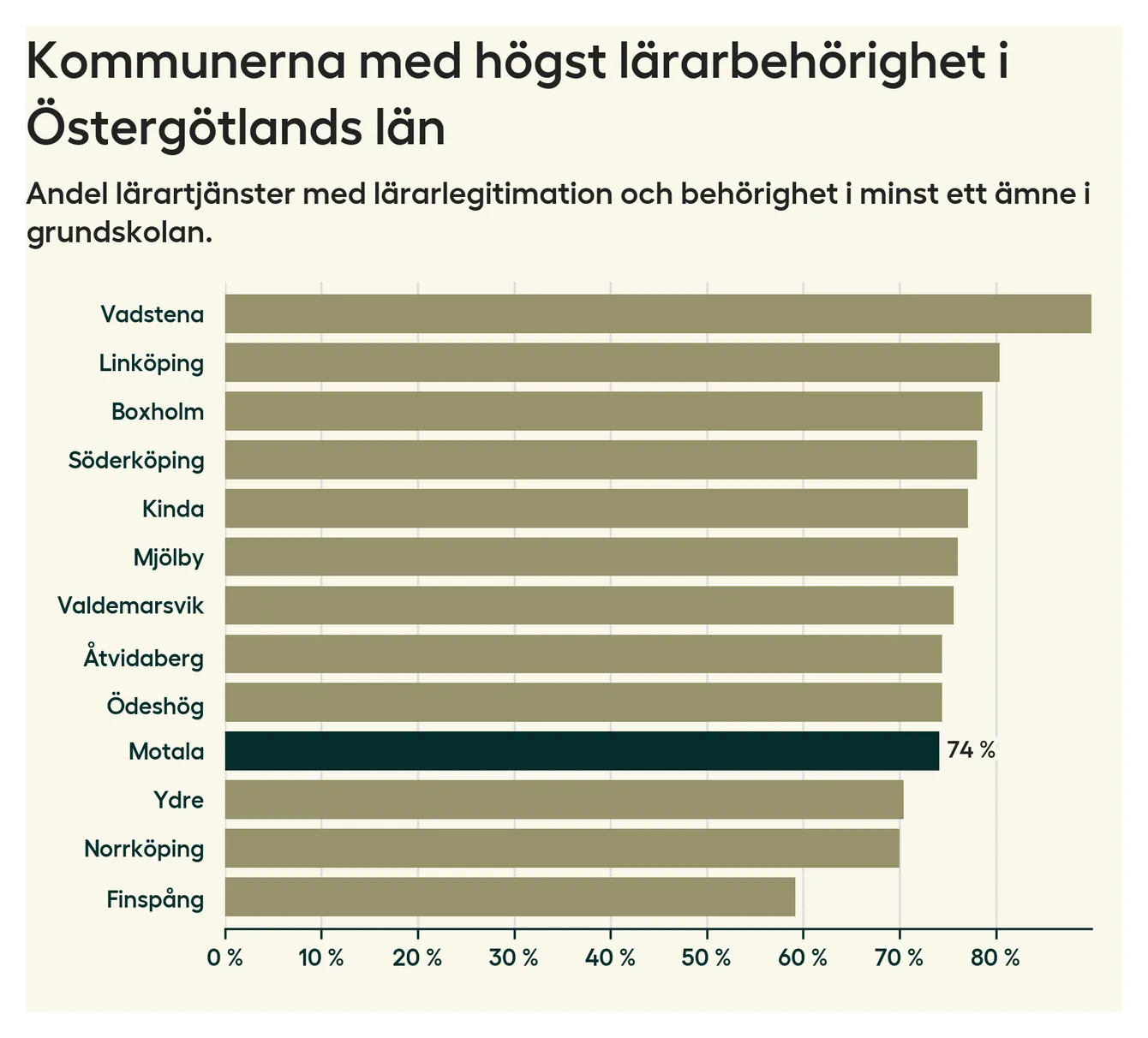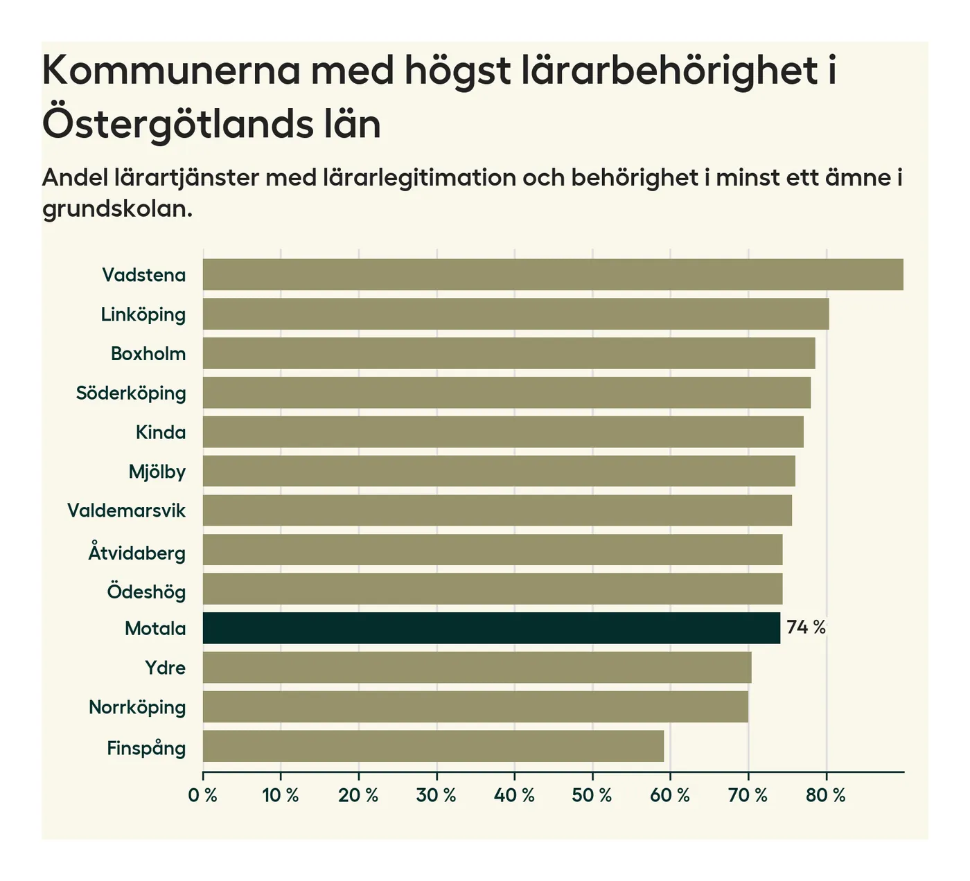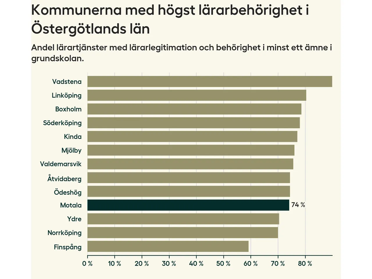 Av de sammanlagt 339 heltidstjänsterna i grundskolan i Motala kommun (motsvarande 390 lärare) var det 251 som hade lärarlegitimation och behörighet i minst ett ämne.