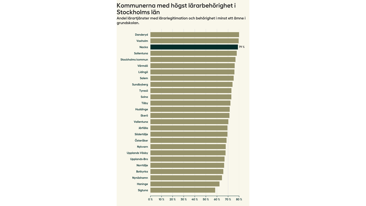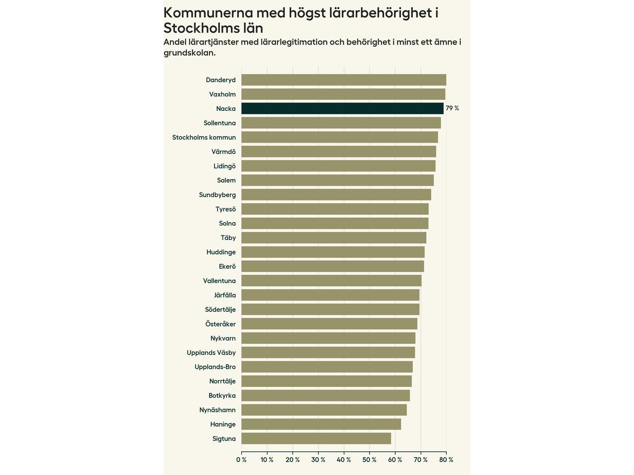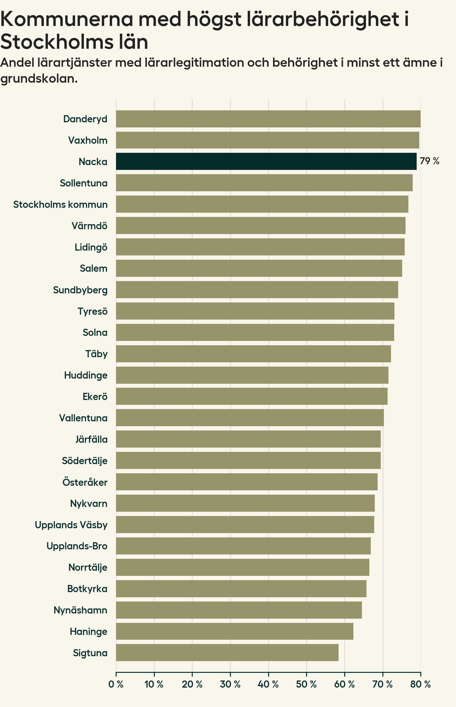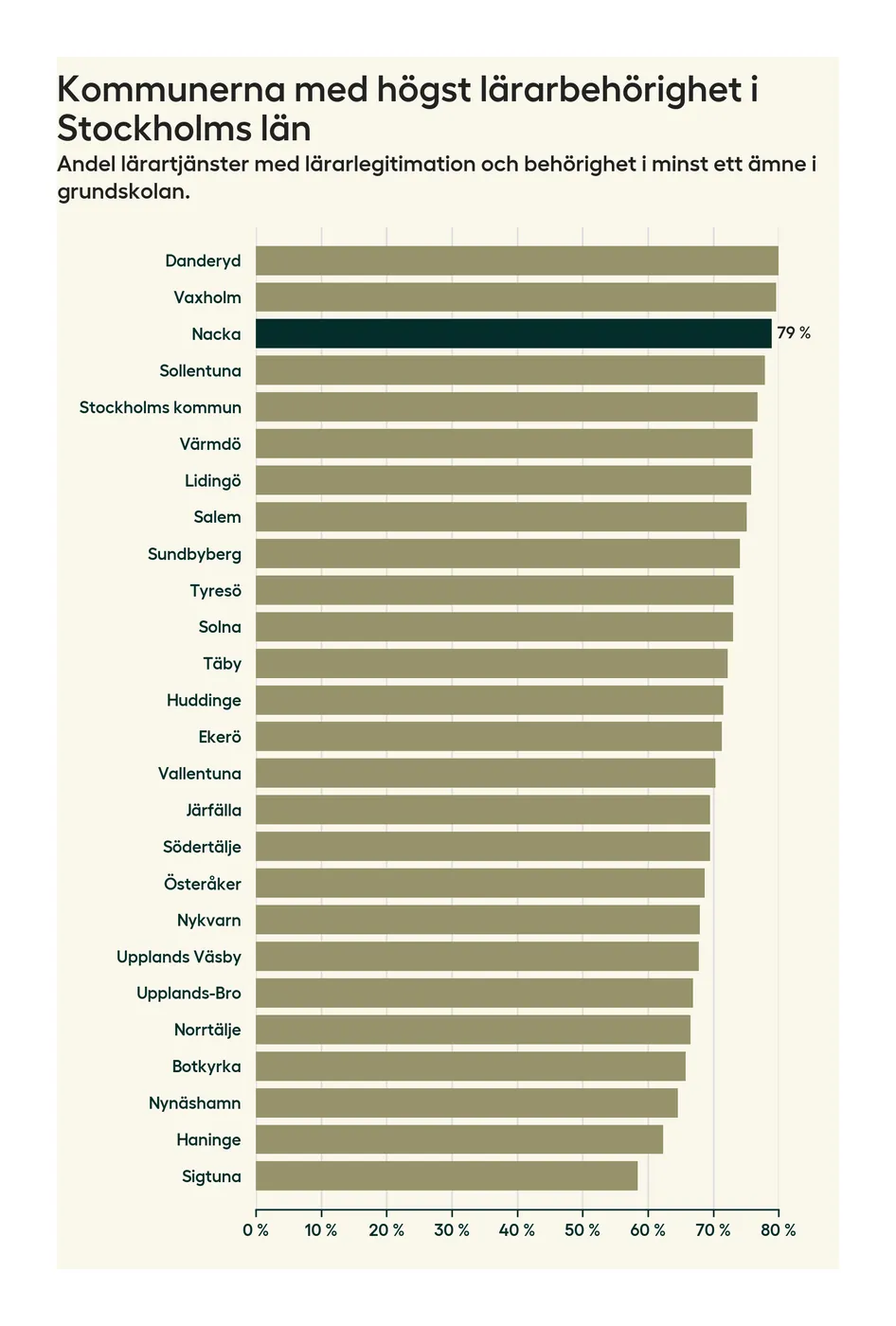 Av de sammanlagt 783 heltidstjänsterna i grundskolan i Nacka kommun (motsvarande 843 lärare) var det 618 som hade lärarlegitimation och behörighet i minst ett ämne.