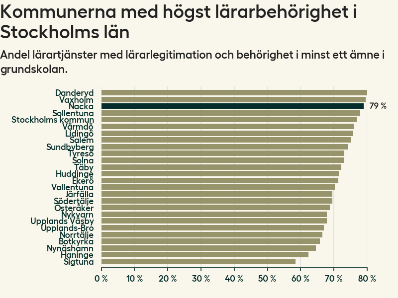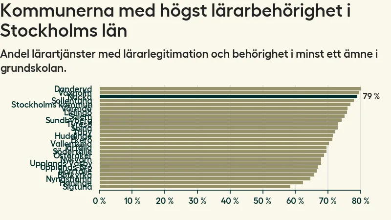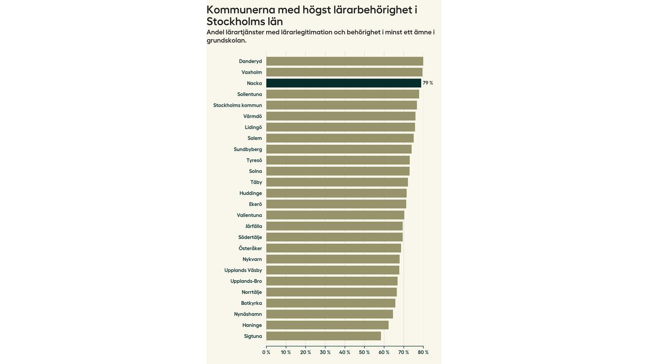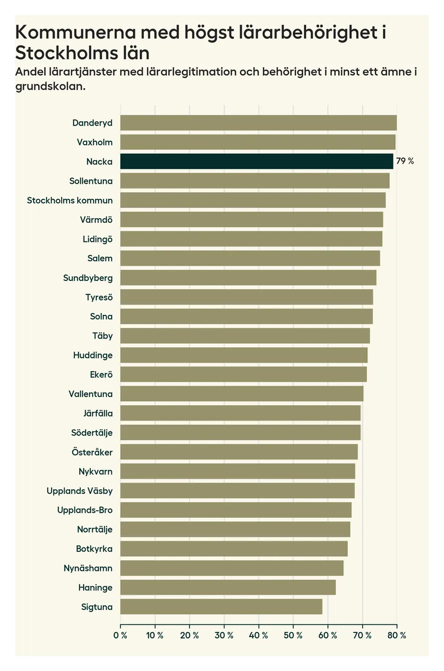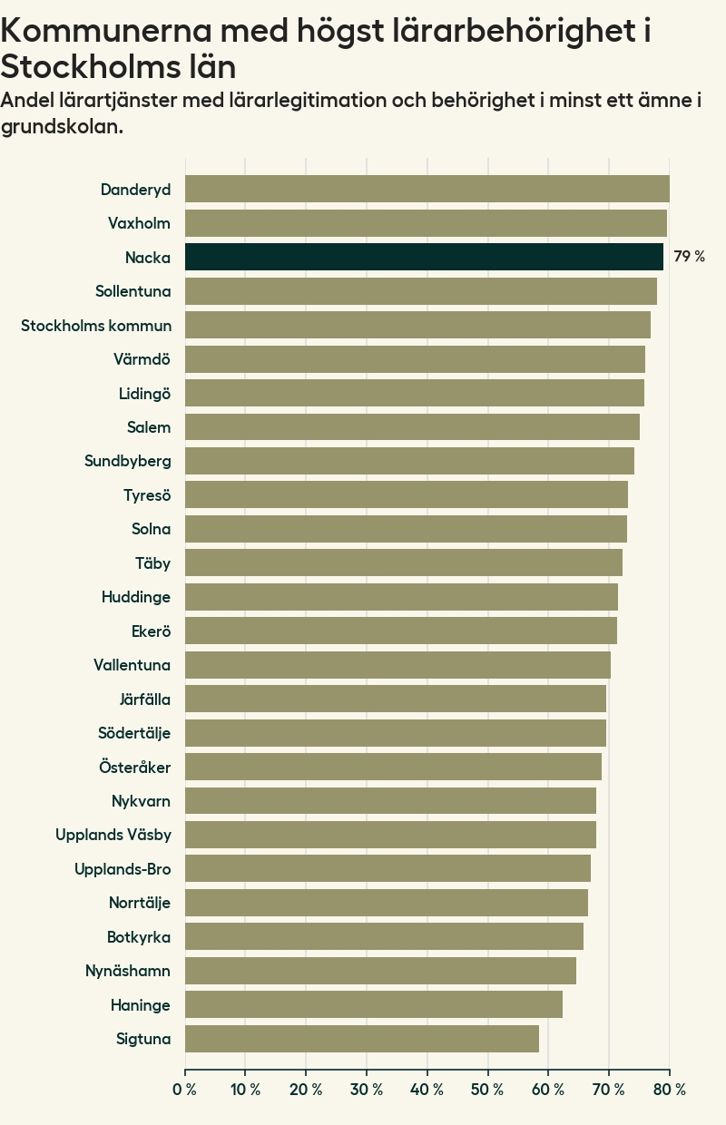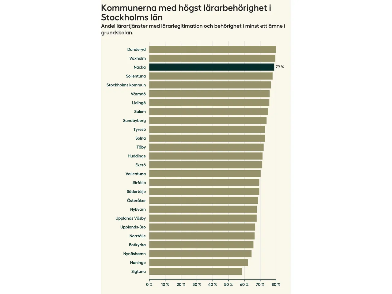 Av de sammanlagt 783 heltidstjänsterna i grundskolan i Nacka kommun (motsvarande 843 lärare) var det 618 som hade lärarlegitimation och behörighet i minst ett ämne.