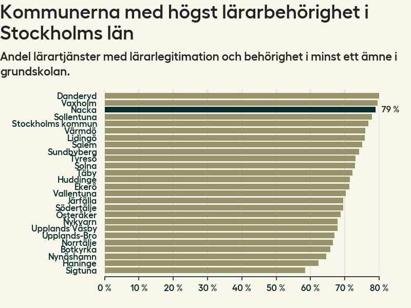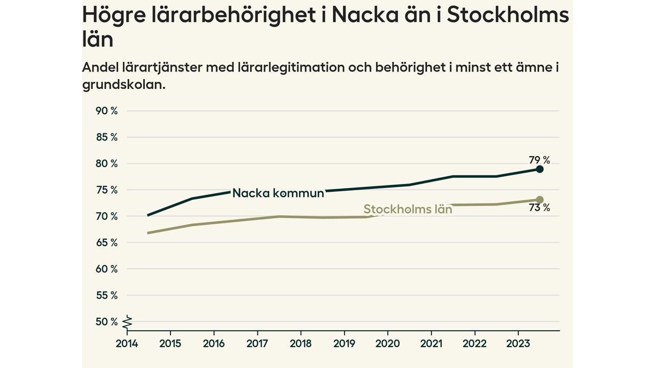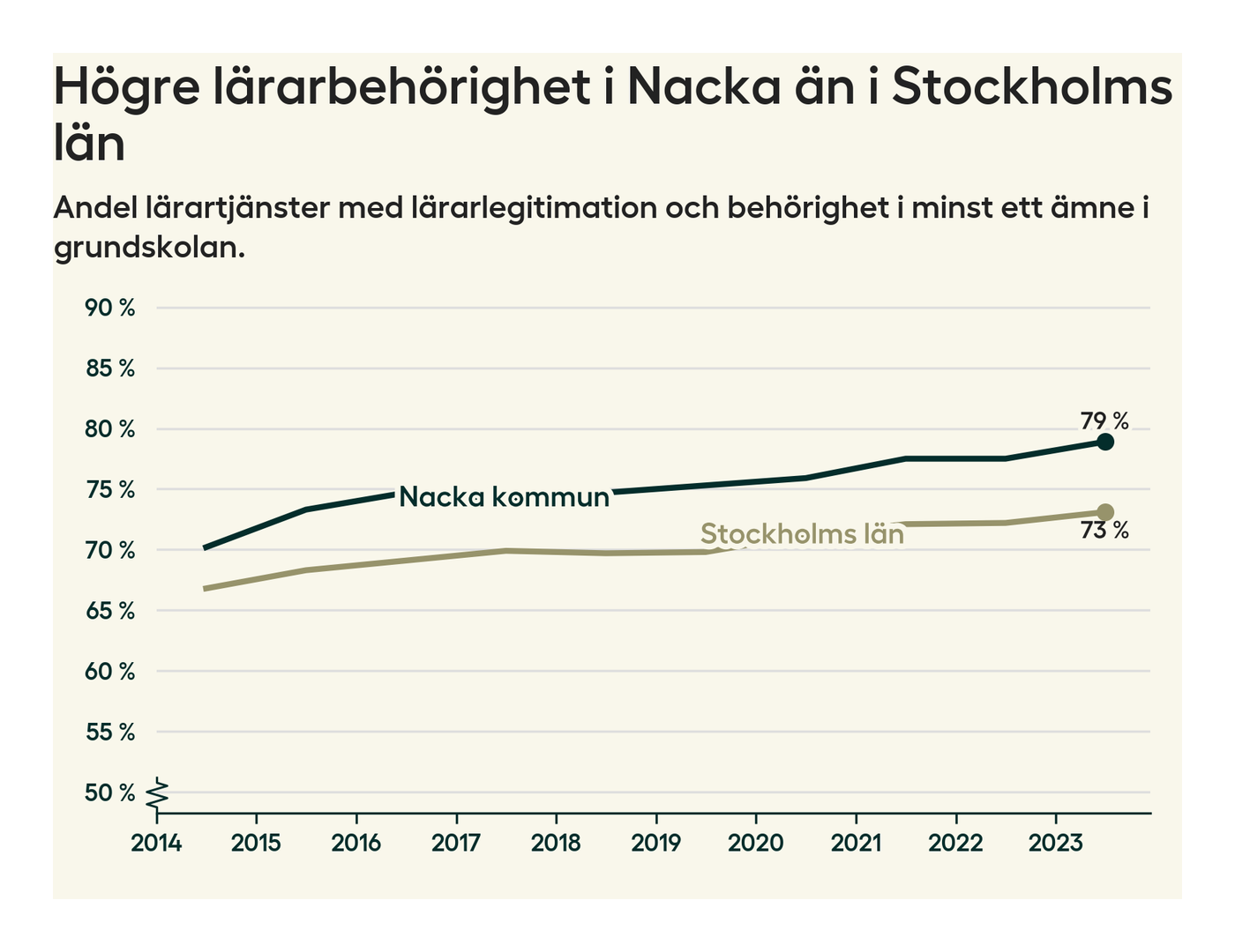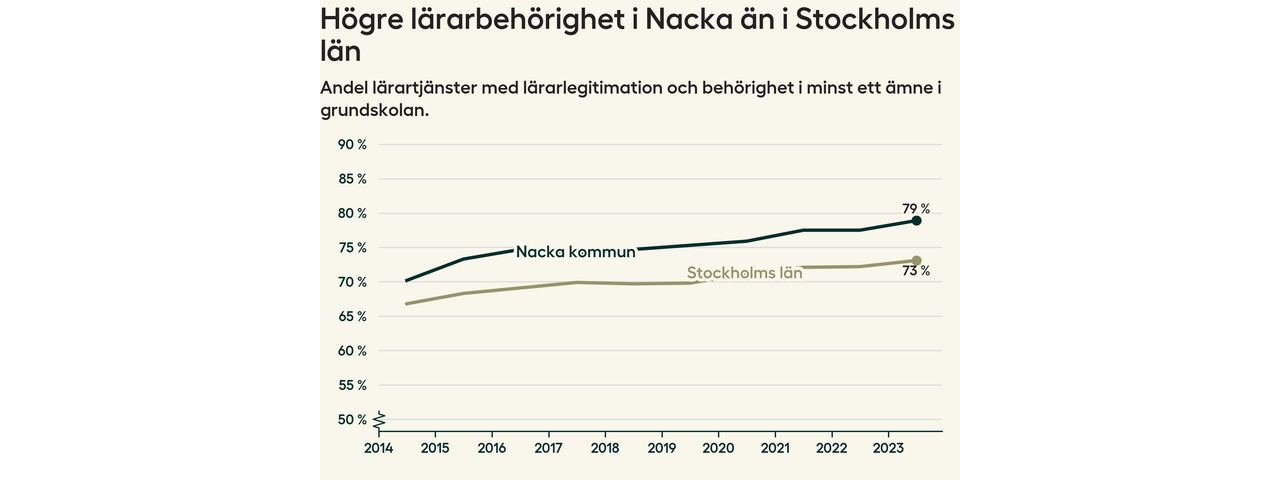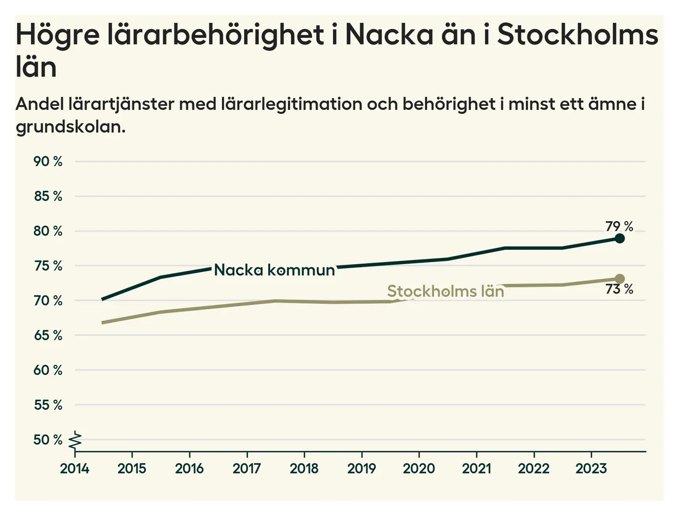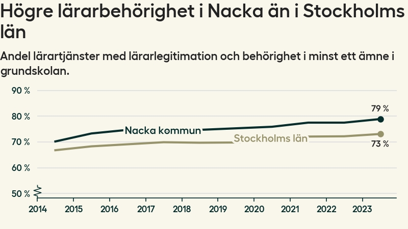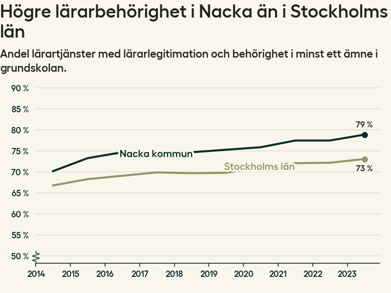 I oktober 2023 hade motsvarande 79 procent av lärarna1 i grundskolan i Nacka kommun lärarlegitimation och behörighet i minst ett ämne. Det är en ökning med en procentenhet jämfört med året innan och den högsta nivån som noterats sedan 2014.