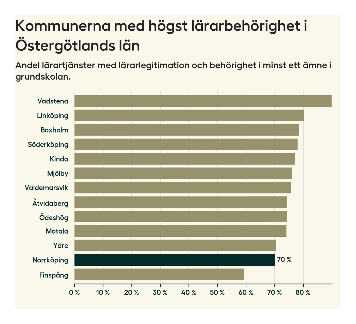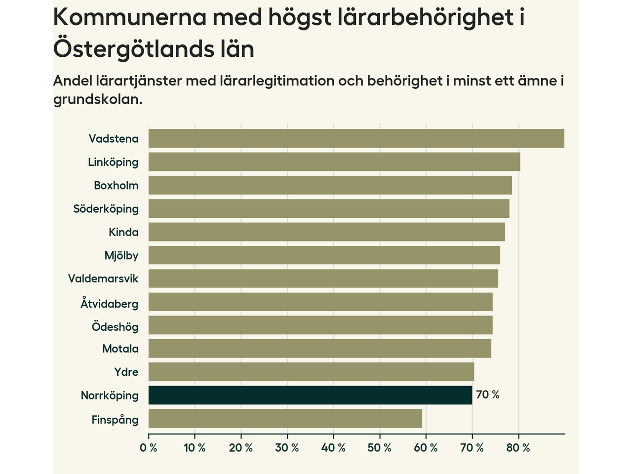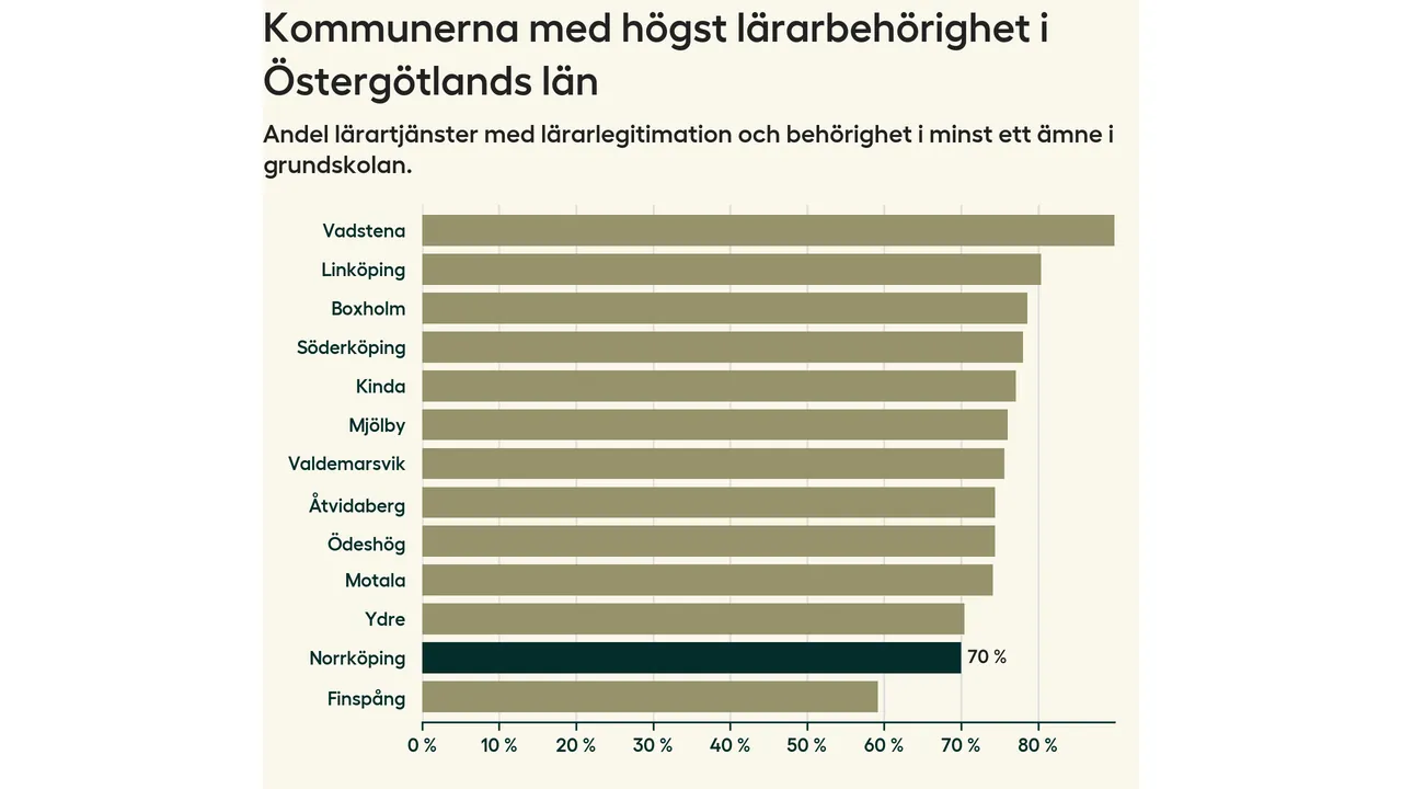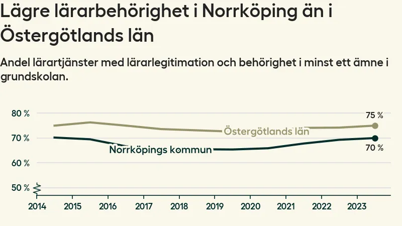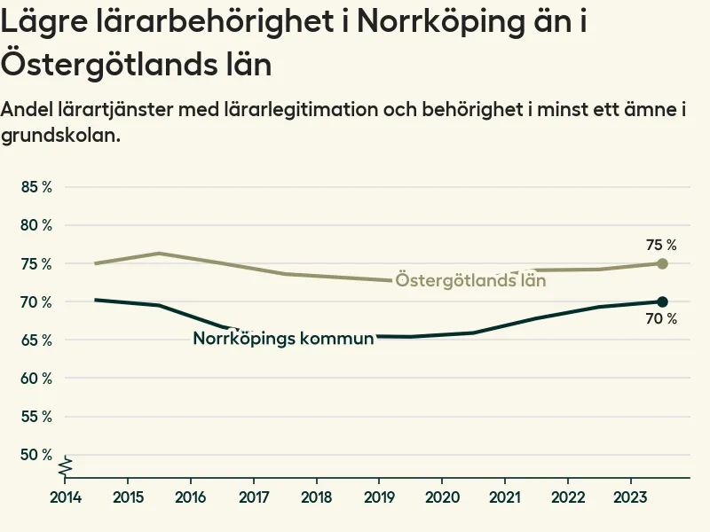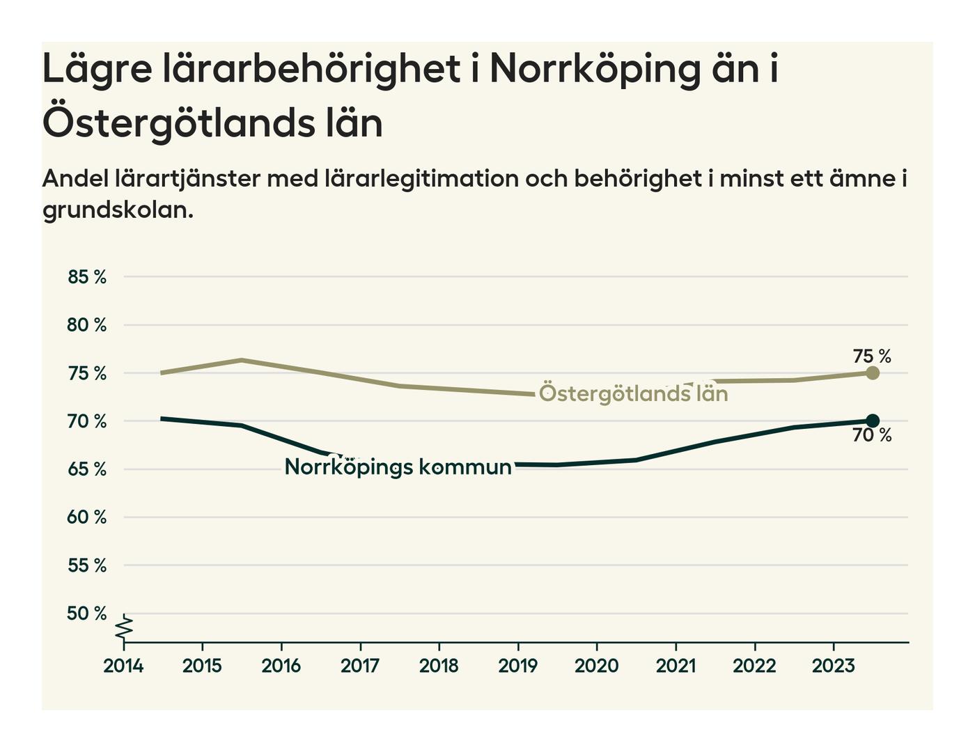 I oktober 2023 hade motsvarande 70 procent av lärarna1 i grundskolan i Norrköpings kommun lärarlegitimation och behörighet i minst ett ämne. Det innebär att kommunen har den näst lägsta lärarbehörigheten i Östergötlands län.