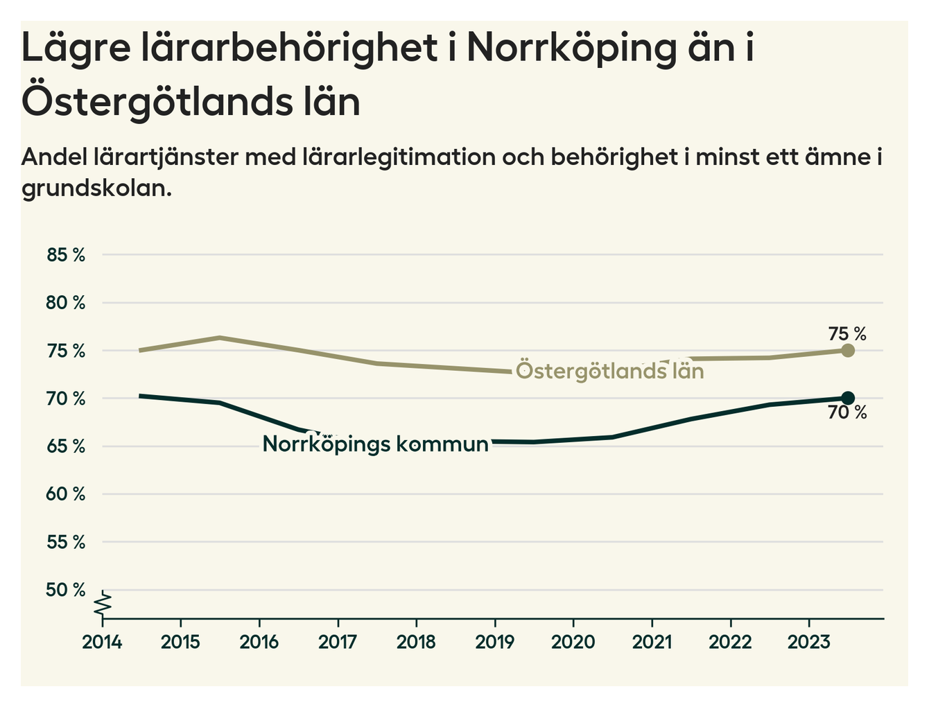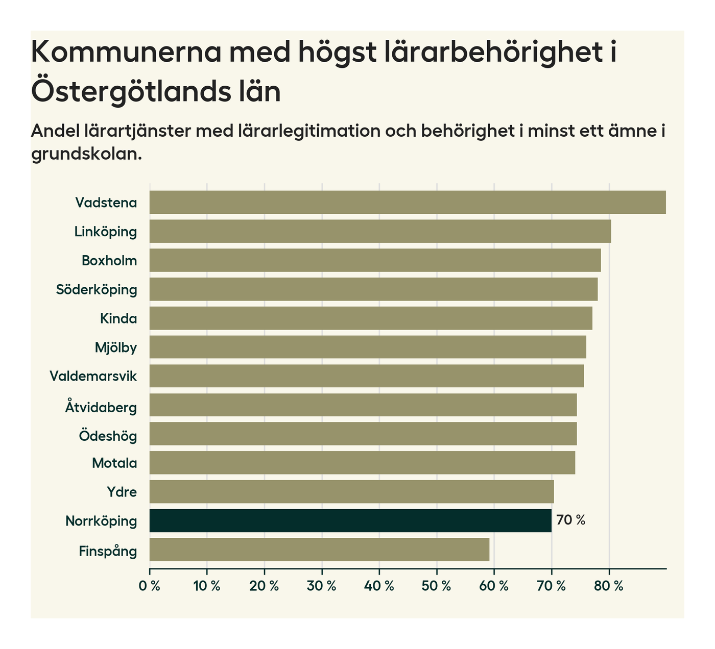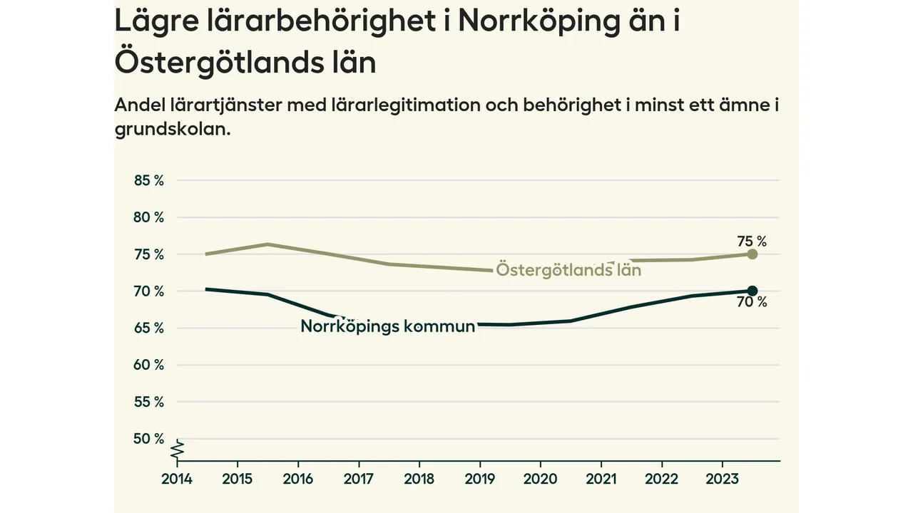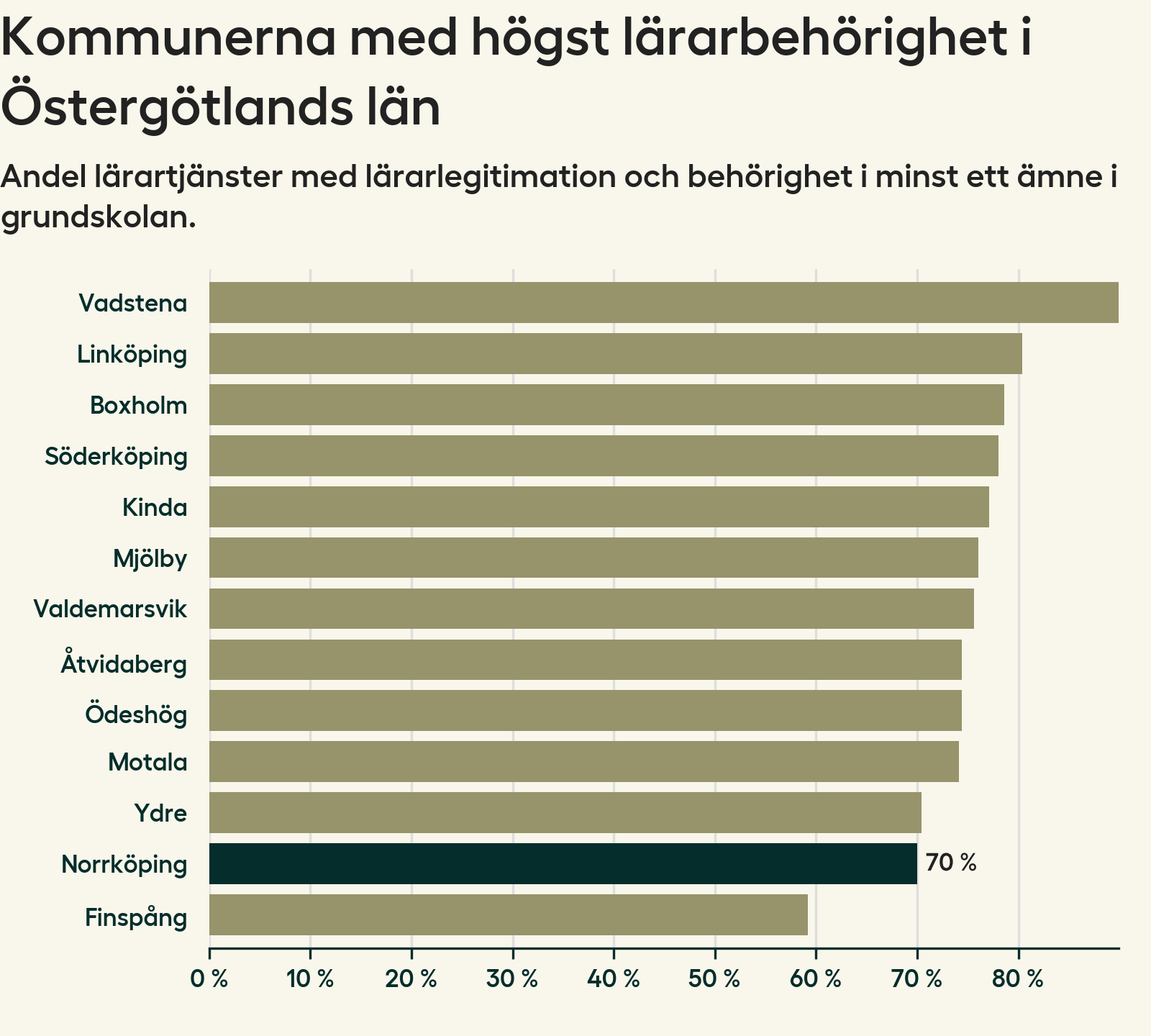 I oktober 2023 hade motsvarande 70 procent av lärarna1 i grundskolan i Norrköpings kommun lärarlegitimation och behörighet i minst ett ämne. Det innebär att kommunen har den näst lägsta lärarbehörigheten i Östergötlands län.