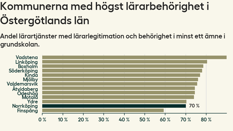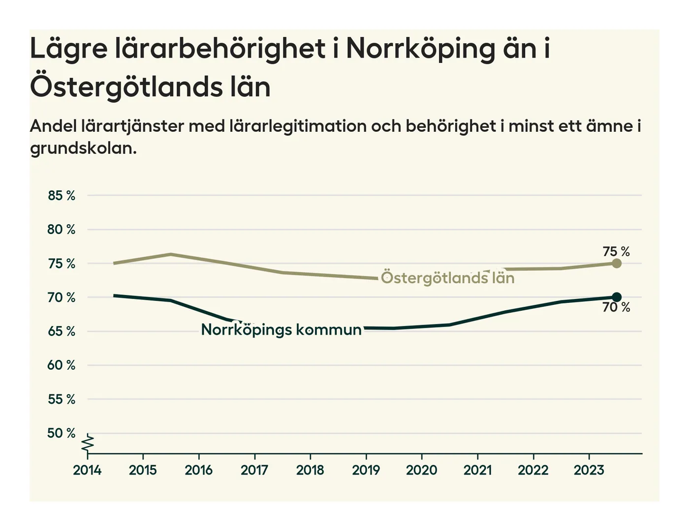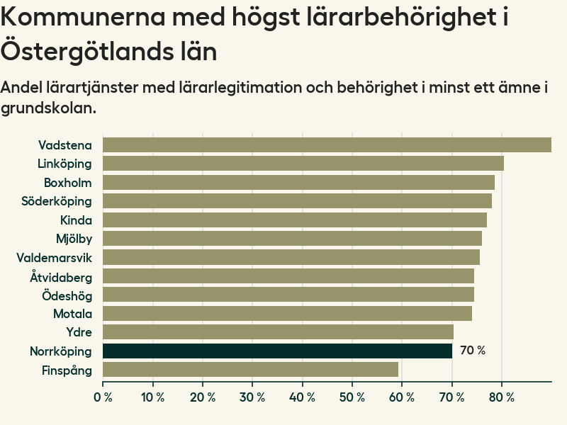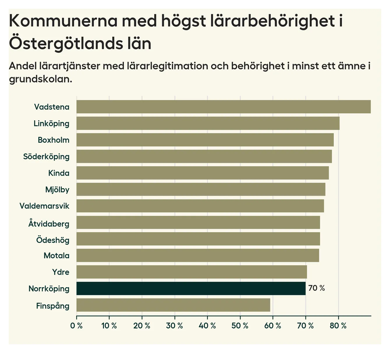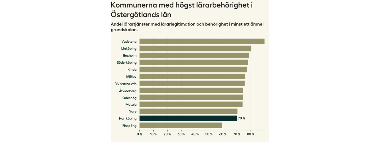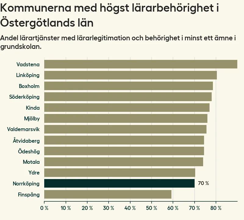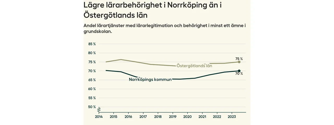 I oktober 2023 hade motsvarande 70 procent av lärarna1 i grundskolan i Norrköpings kommun lärarlegitimation och behörighet i minst ett ämne. Det innebär att kommunen har den näst lägsta lärarbehörigheten i Östergötlands län.