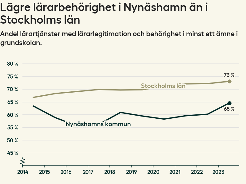 I oktober 2023 hade motsvarande 65 procent av lärarna​​1 i grundskolan i Nynäshamns kommun lärarlegitimation och behörighet i minst ett ämne. Det är en ökning med fyra procentenheter jämfört med året innan och den högsta nivån som noterats sedan 2014.