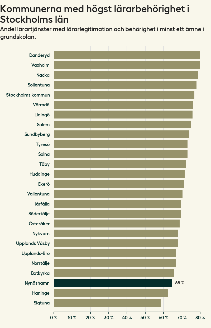Av de sammanlagt 150 heltidstjänsterna i grundskolan i Nynäshamns kommun (motsvarande 174 lärare) var det 97 som hade lärarlegitimation och behörighet i minst ett ämne.