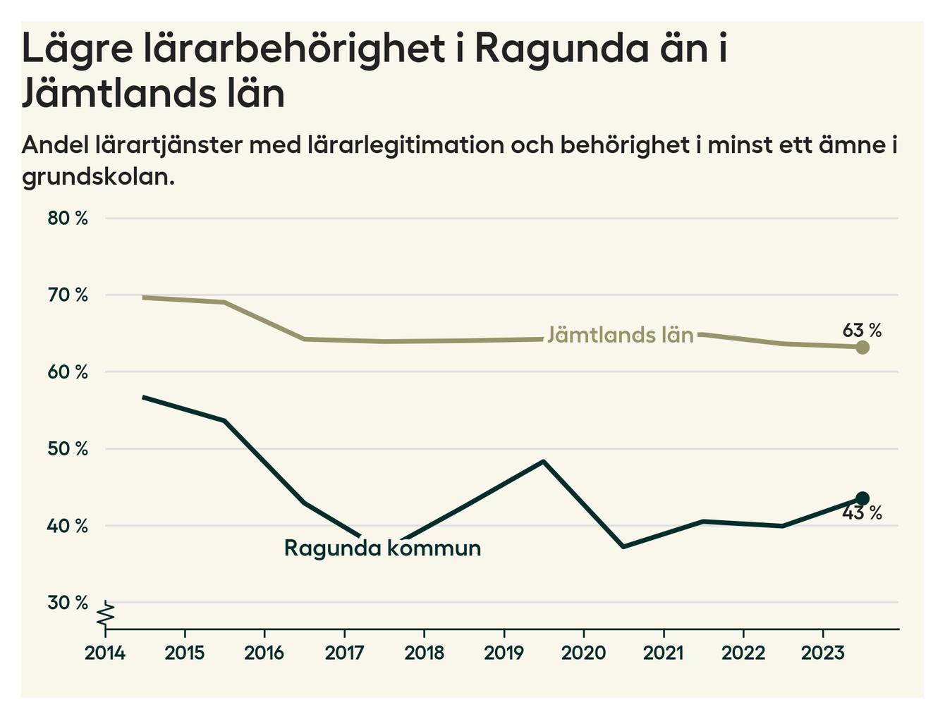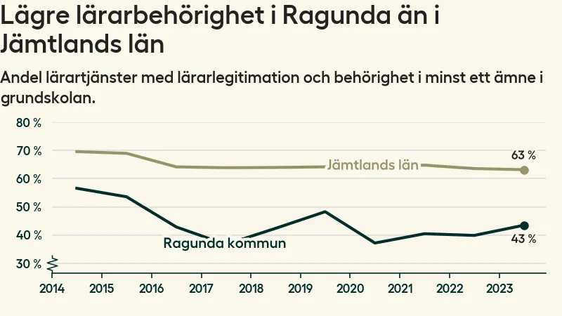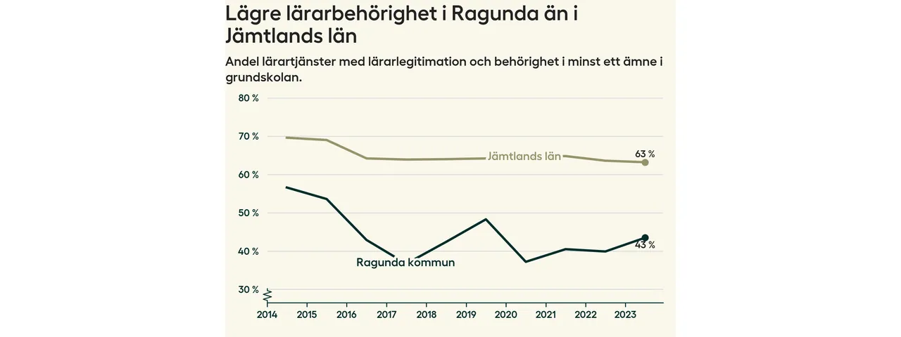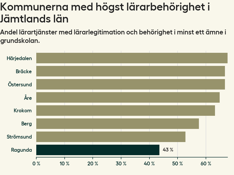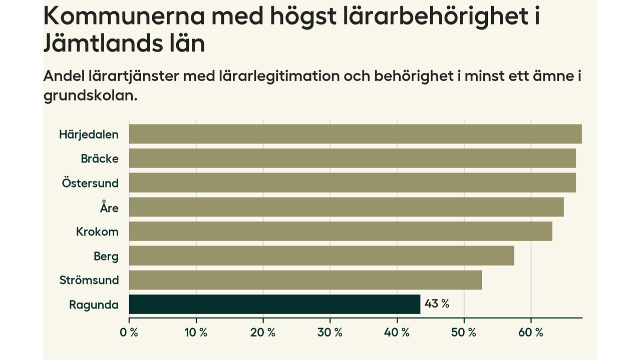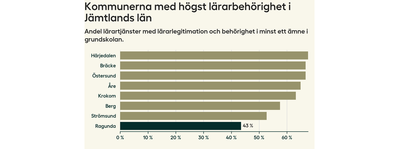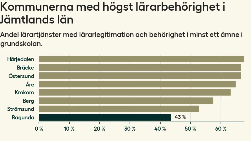 I oktober 2023 hade motsvarande 44 procent av lärarna1 i grundskolan i Ragunda kommun lärarlegitimation och behörighet i minst ett ämne. Det innebär att kommunen har den lägsta lärarbehörigheten i hela landet.