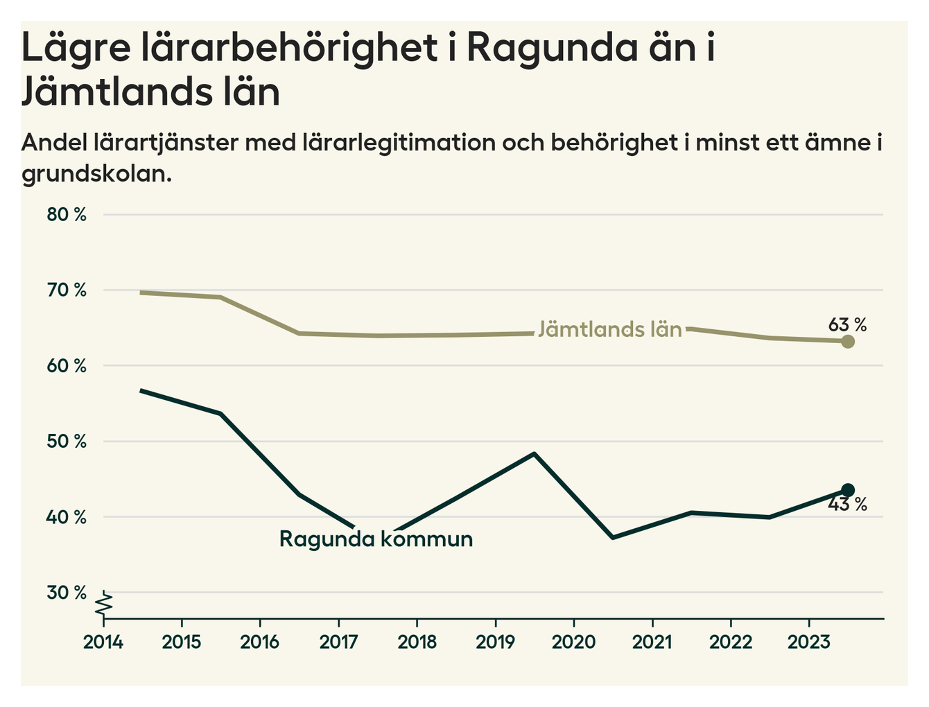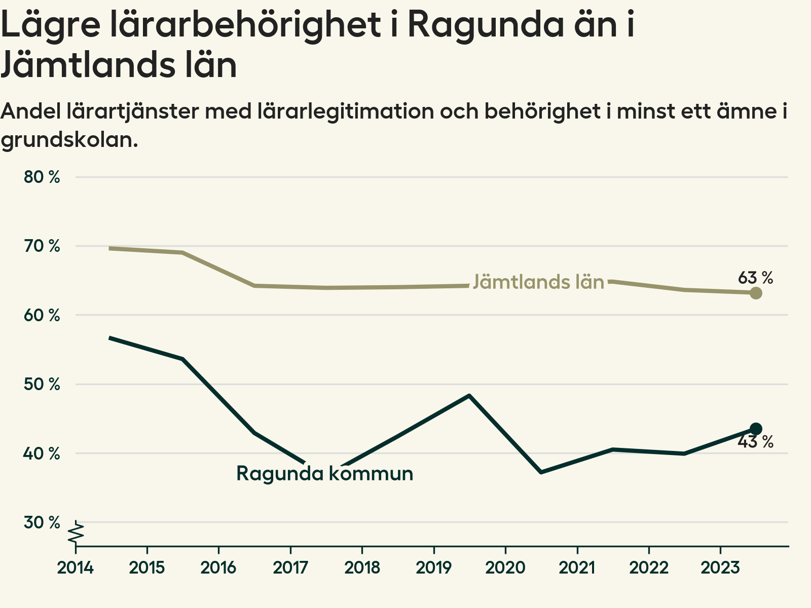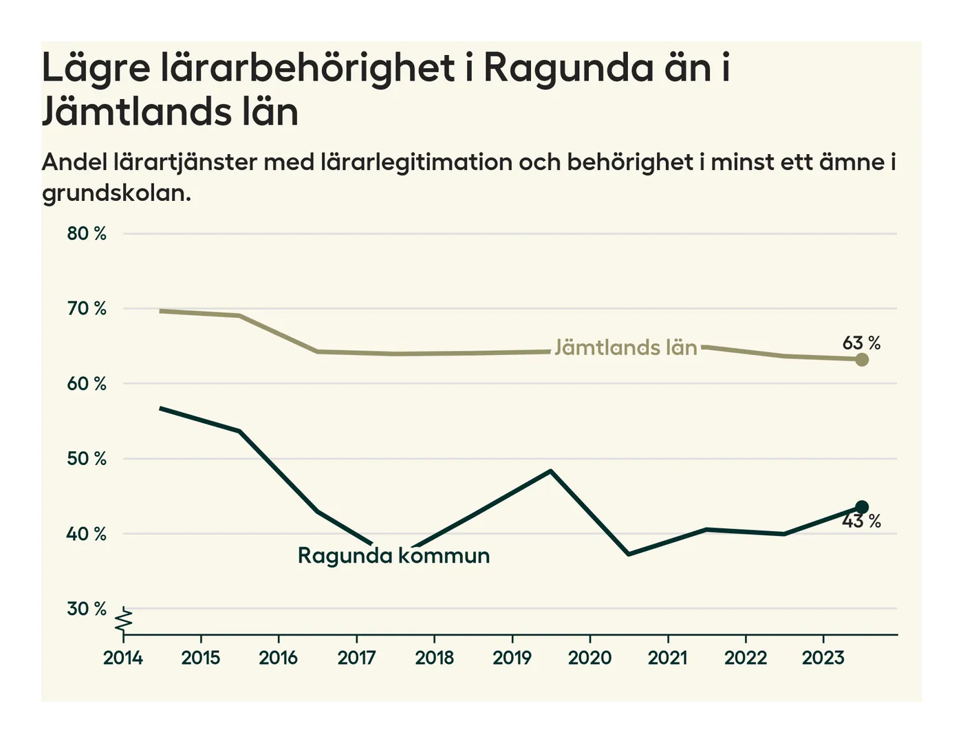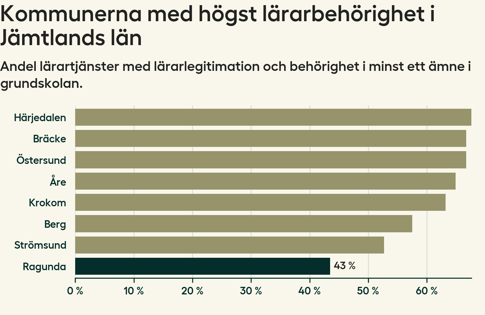 I oktober 2023 hade motsvarande 44 procent av lärarna1 i grundskolan i Ragunda kommun lärarlegitimation och behörighet i minst ett ämne. Det innebär att kommunen har den lägsta lärarbehörigheten i hela landet.