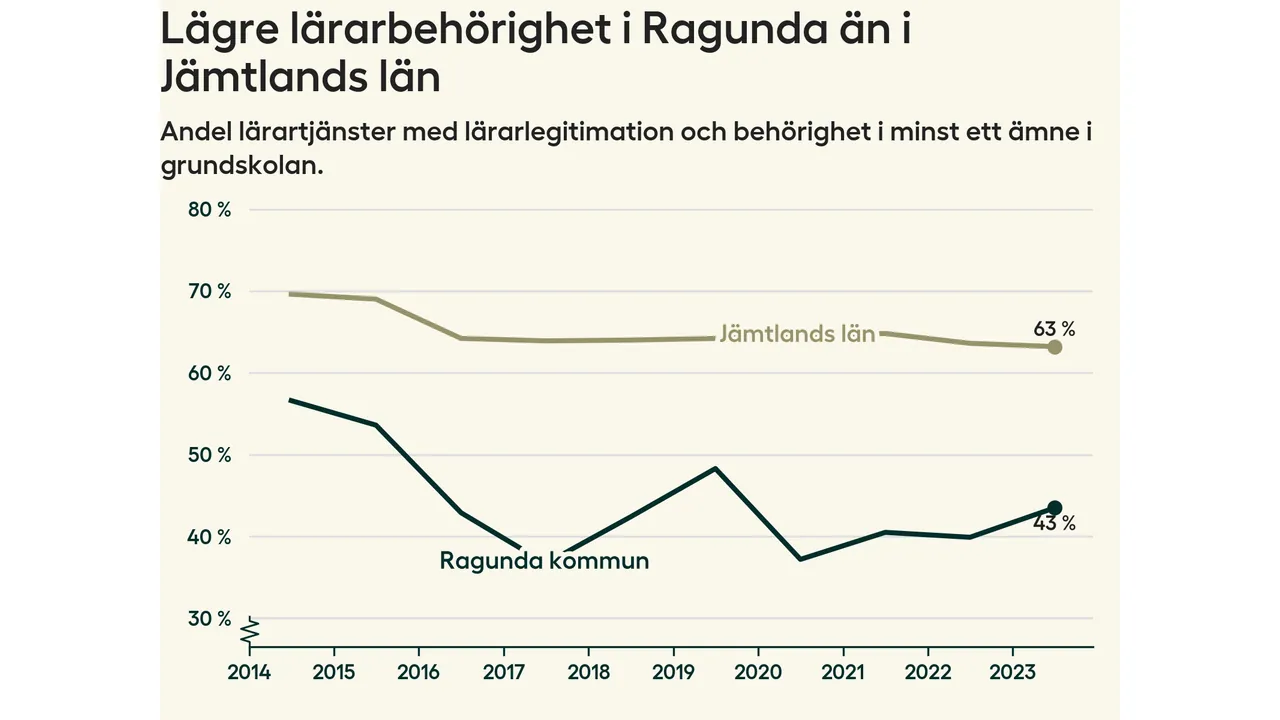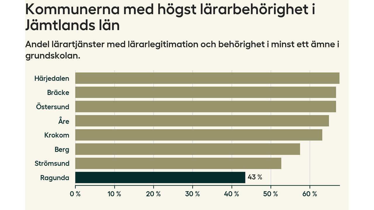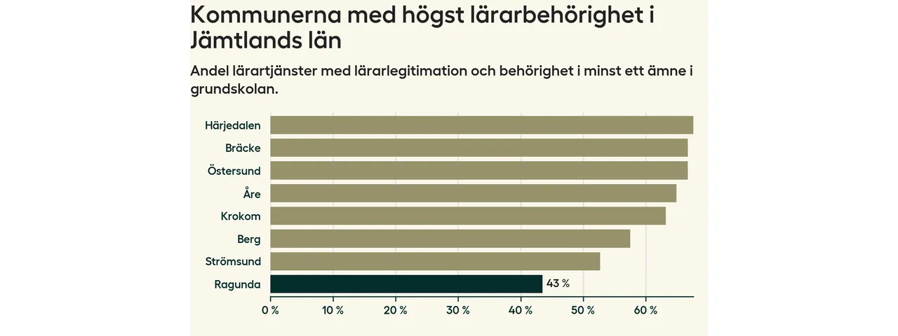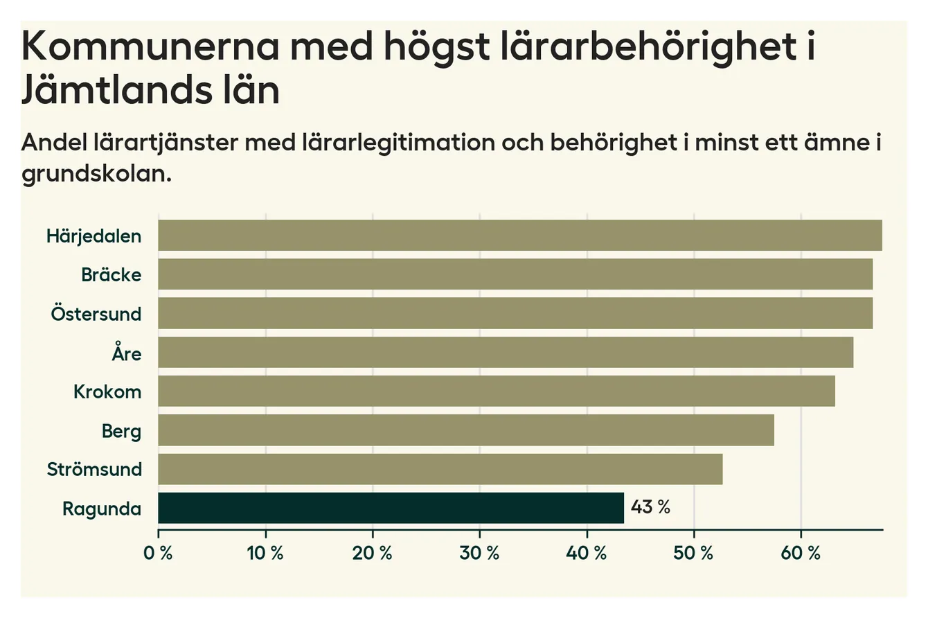 Av de sammanlagt 54 heltidstjänsterna i grundskolan i Ragunda kommun (motsvarande 60 lärare) var det 23 som hade lärarlegitimation och behörighet i minst ett ämne.