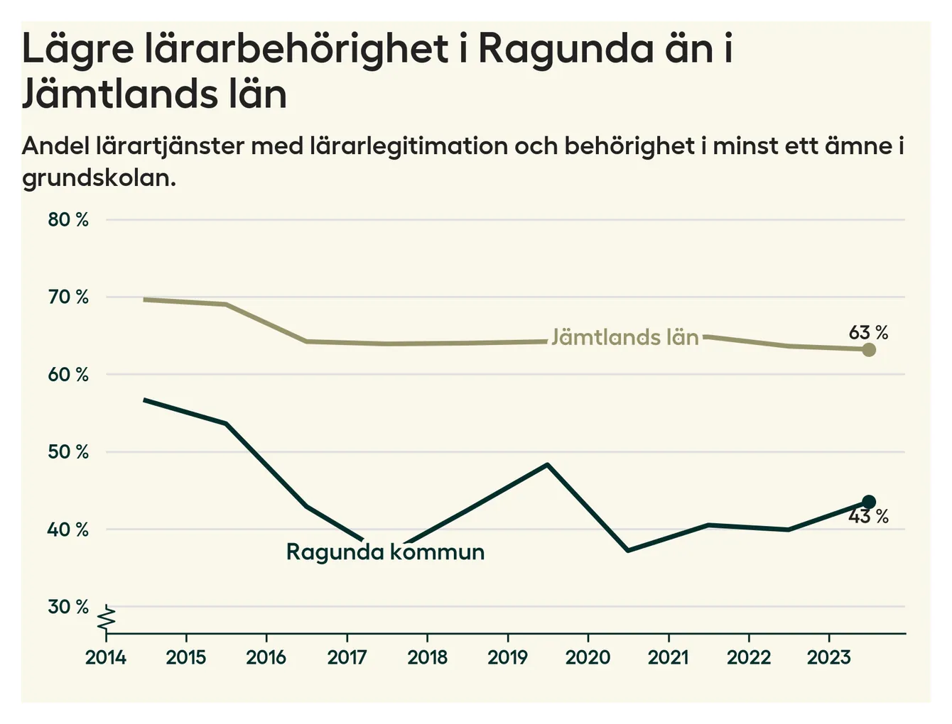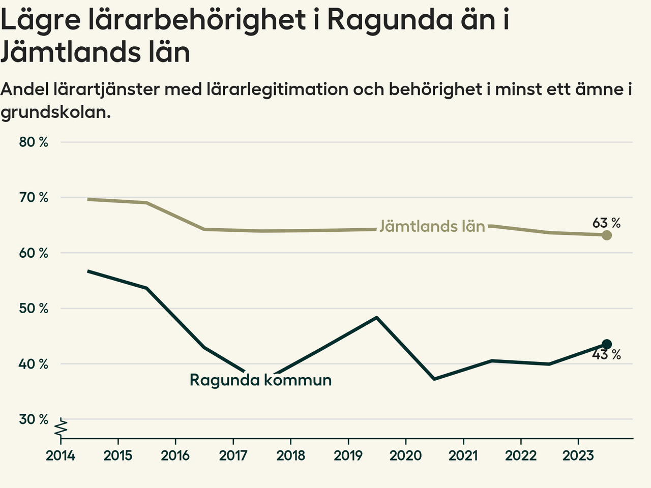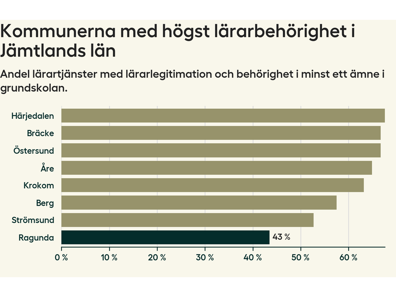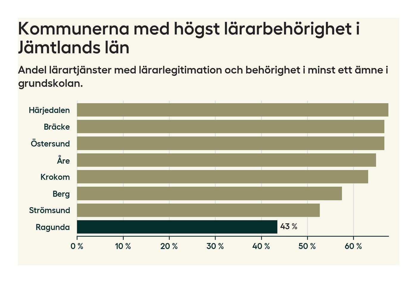 Av de sammanlagt 54 heltidstjänsterna i grundskolan i Ragunda kommun (motsvarande 60 lärare) var det 23 som hade lärarlegitimation och behörighet i minst ett ämne.