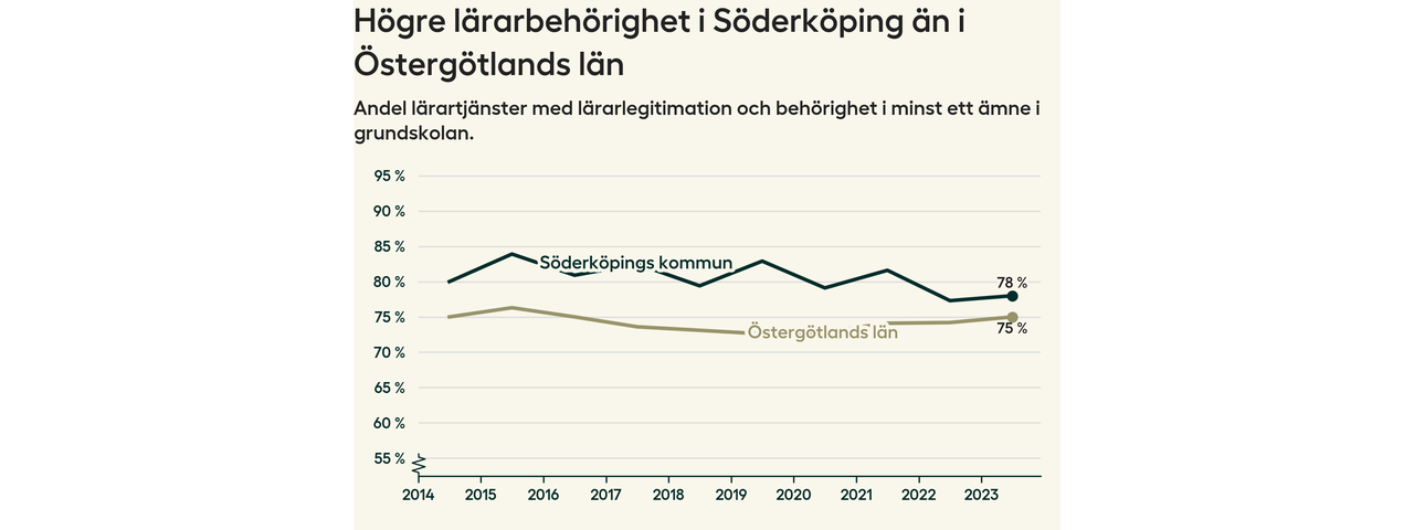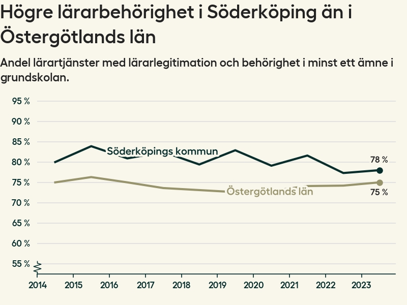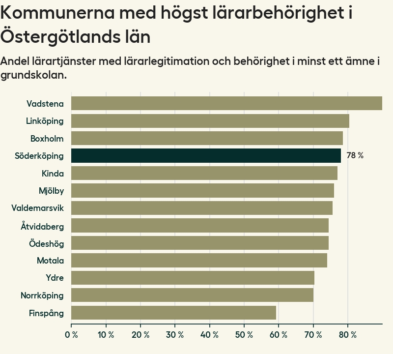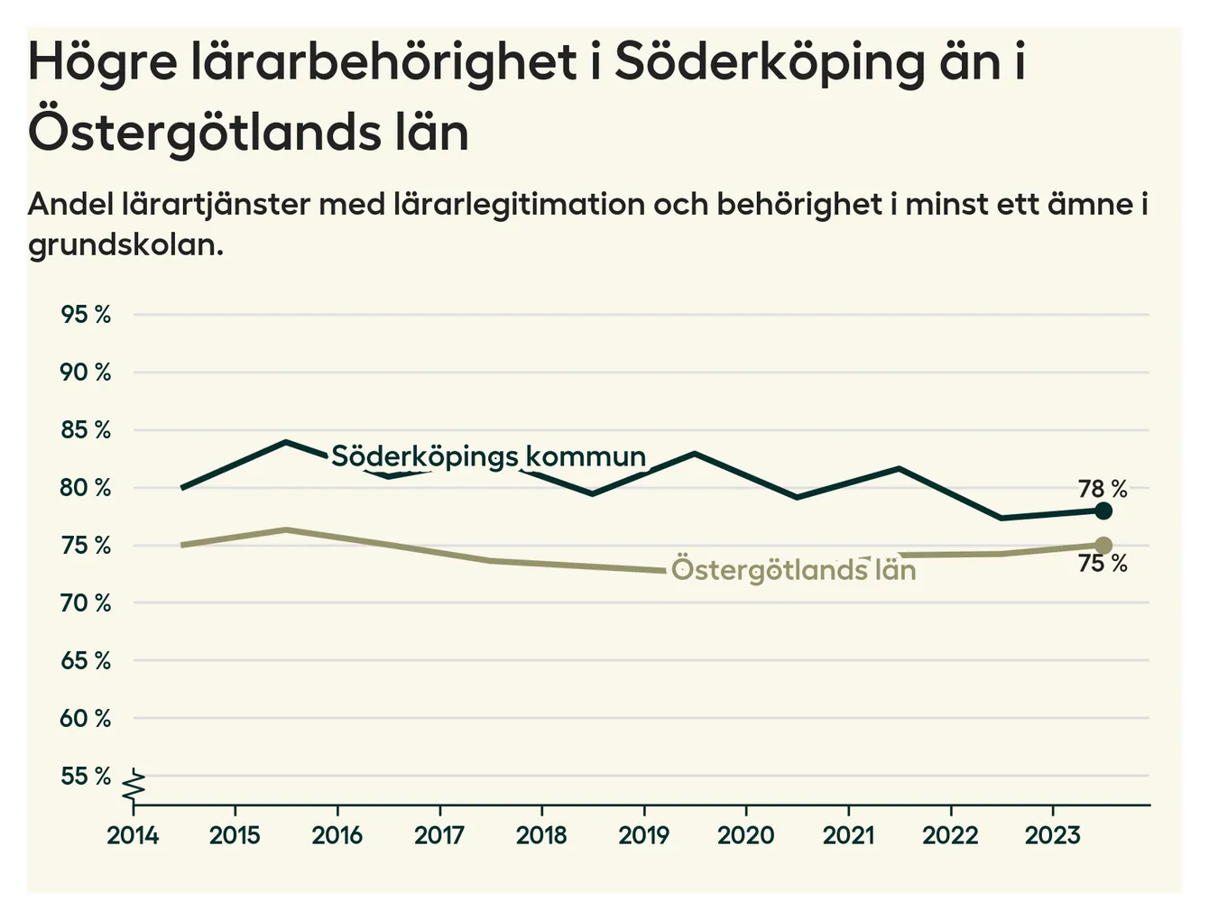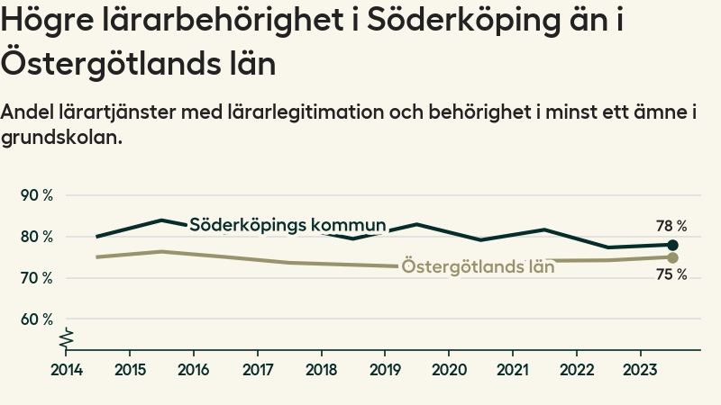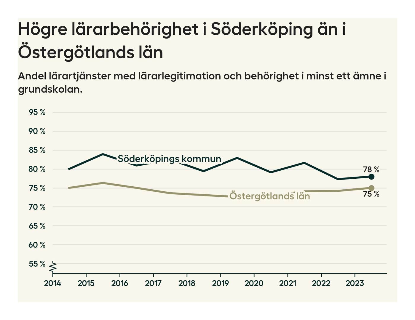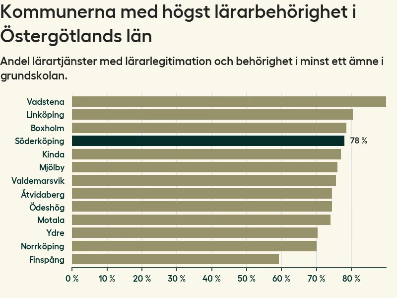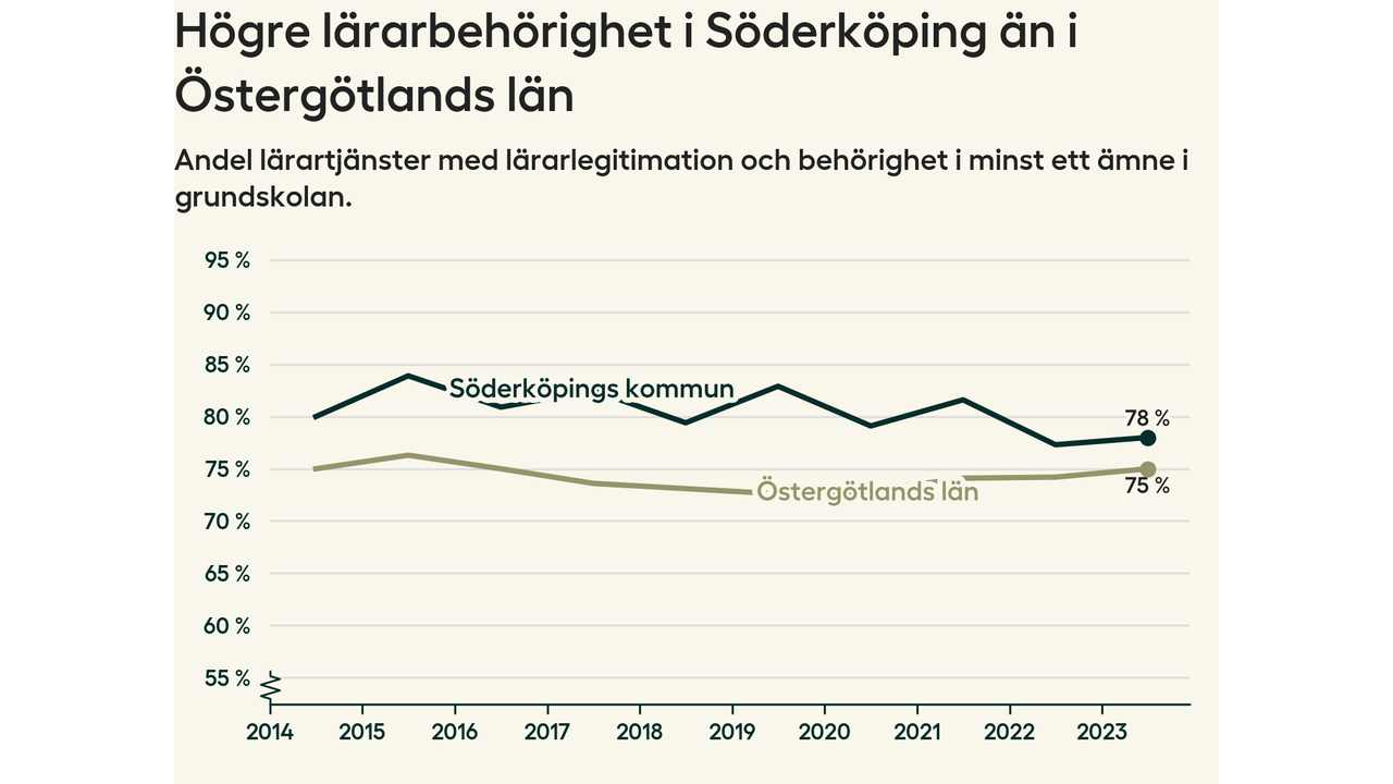 I oktober 2023 hade motsvarande 78 procent av lärarna1 i grundskolan i Söderköpings kommun lärarlegitimation och behörighet i minst ett ämne.