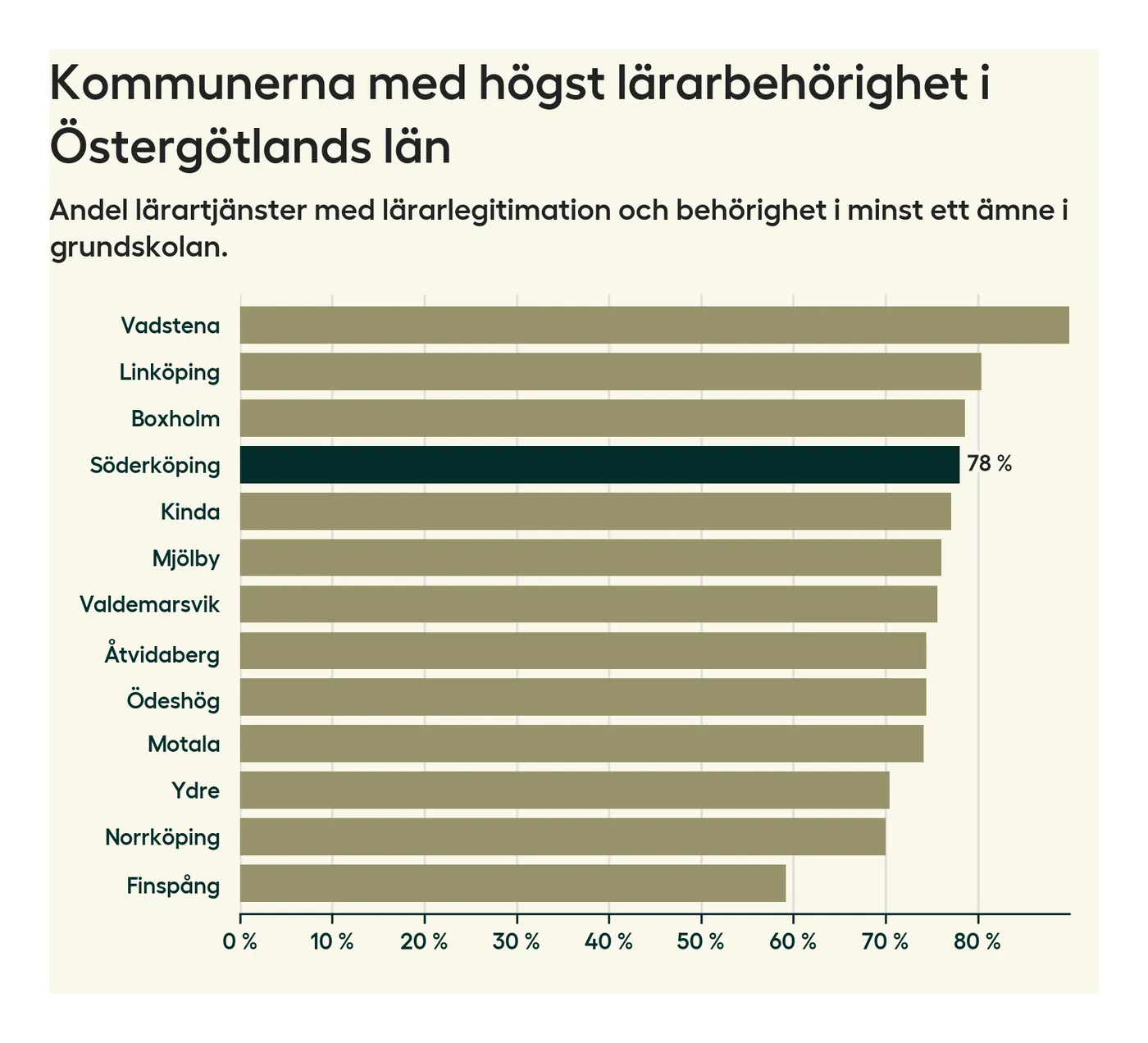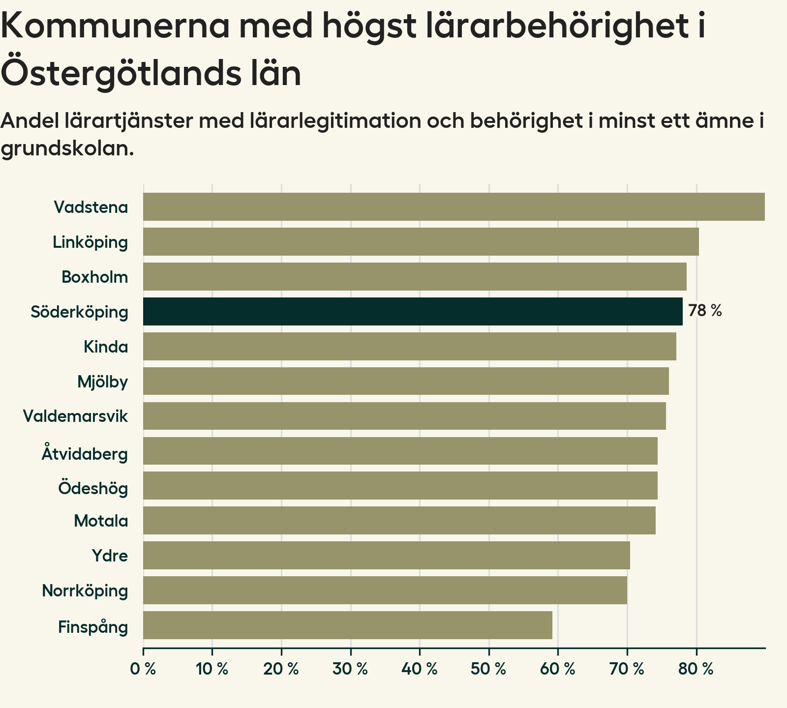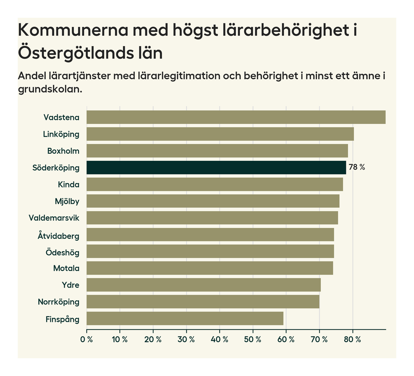 Av de sammanlagt 131 heltidstjänsterna i grundskolan i Söderköpings kommun (motsvarande 155 lärare) var det 102 som hade lärarlegitimation och behörighet i minst ett ämne.