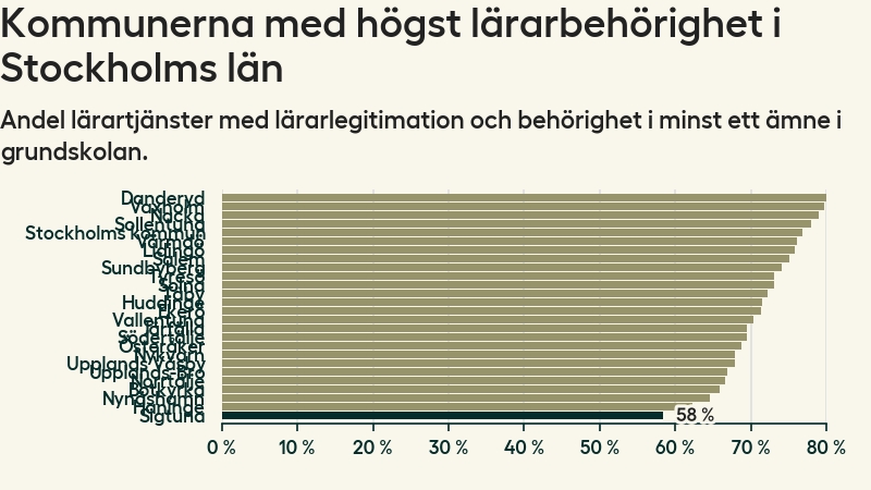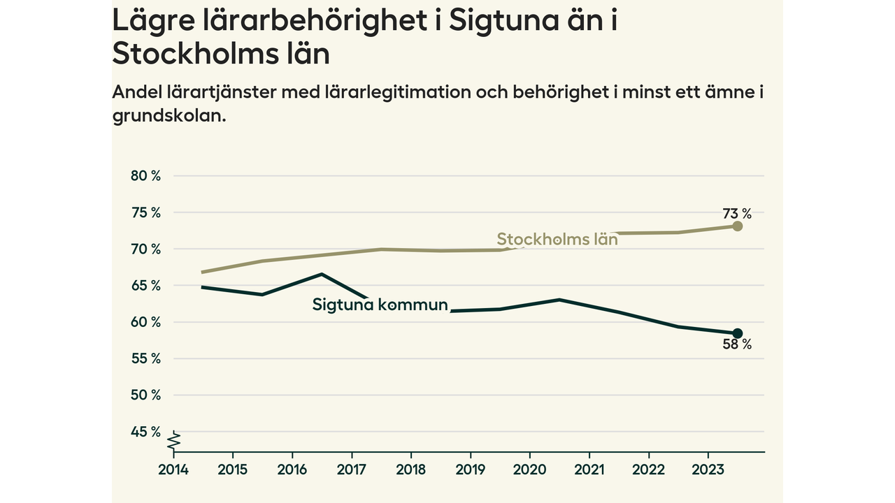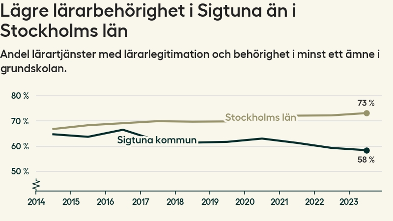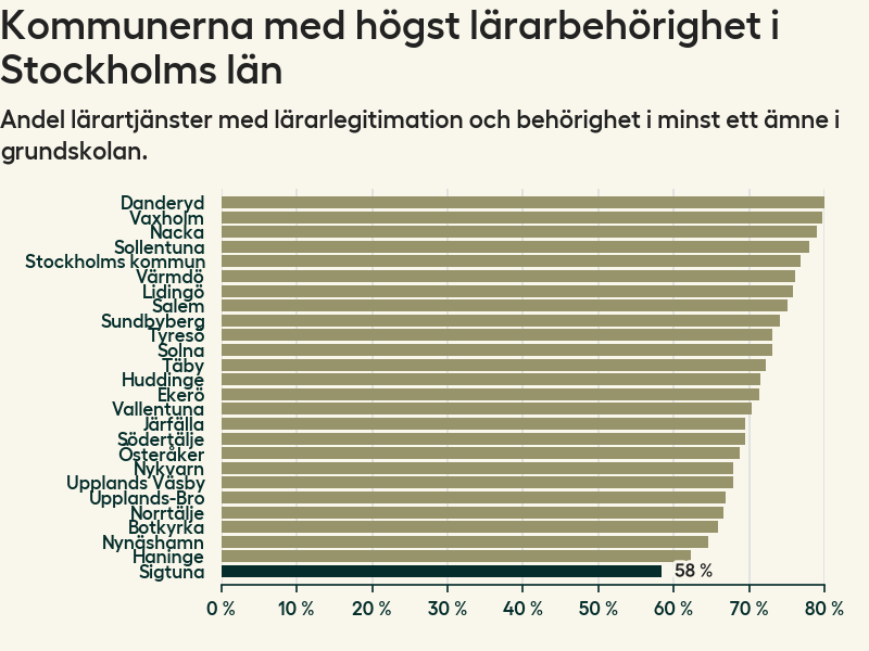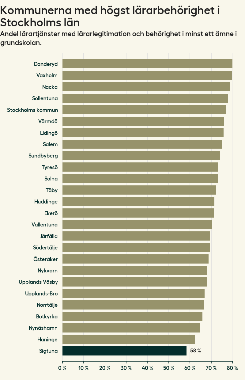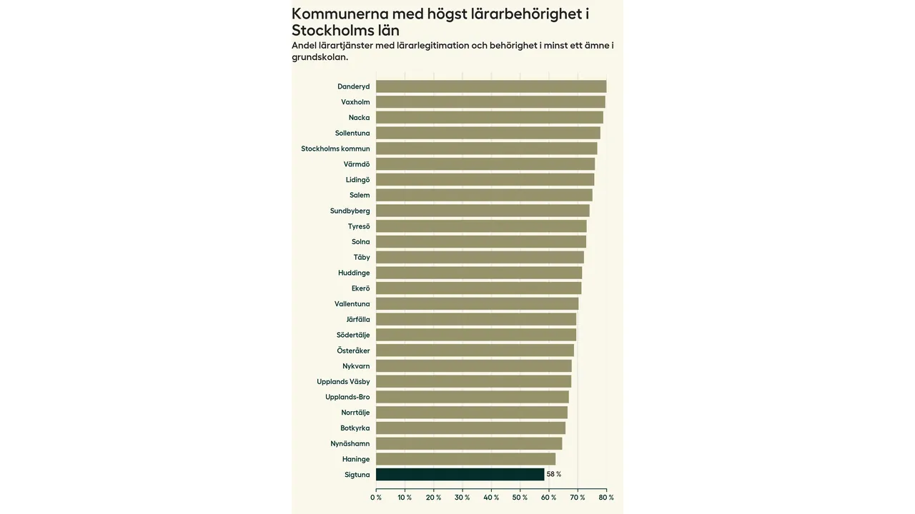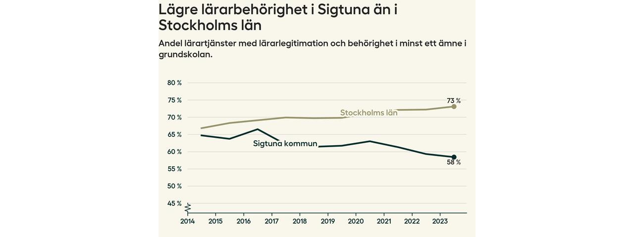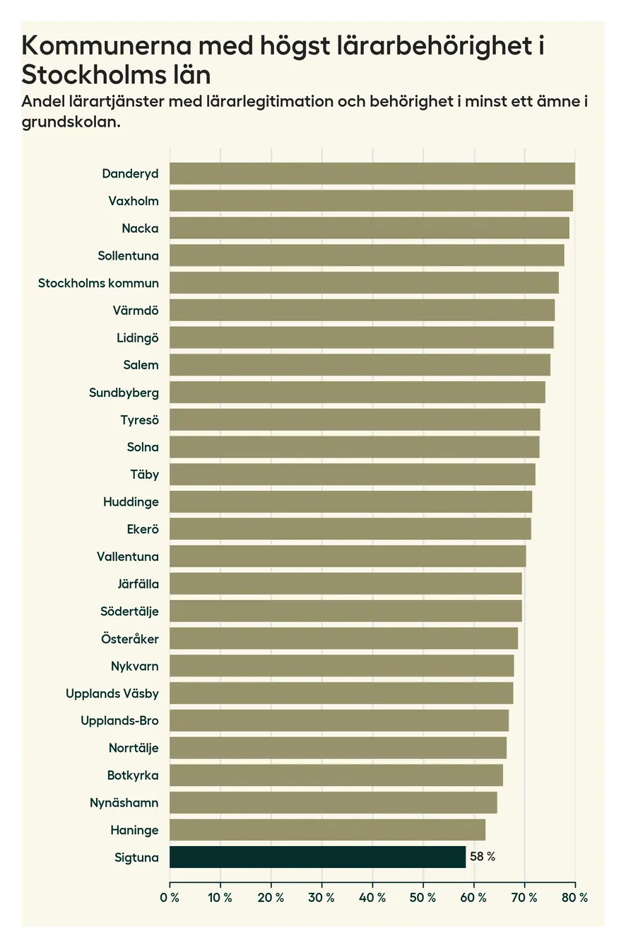 I oktober 2023 hade motsvarande 58 procent av lärarna1 i grundskolan i Sigtuna kommun lärarlegitimation och behörighet i minst ett ämne. Det innebär att kommunen har den lägsta lärarbehörigheten i Stockholms län.