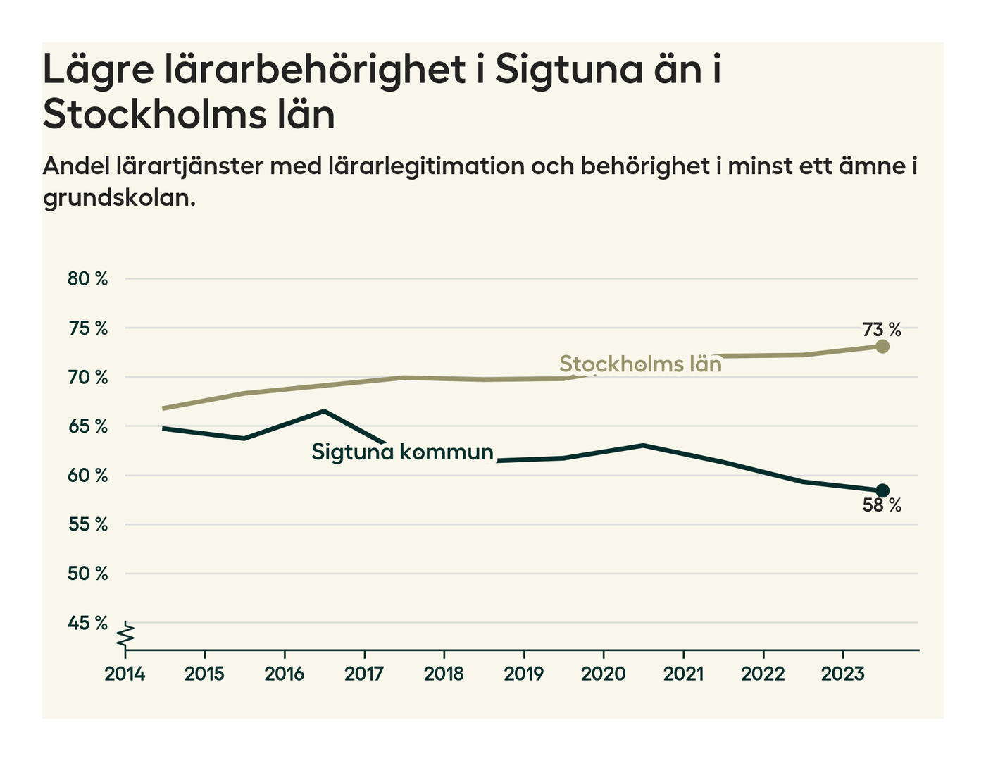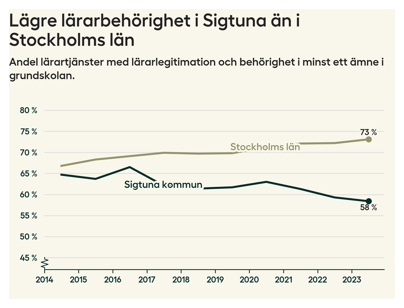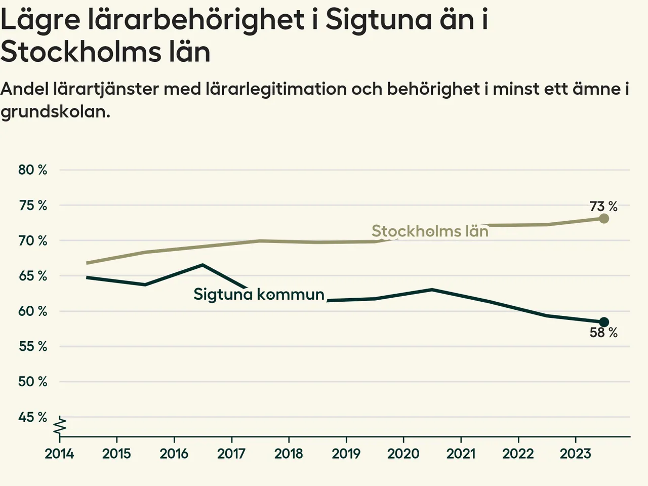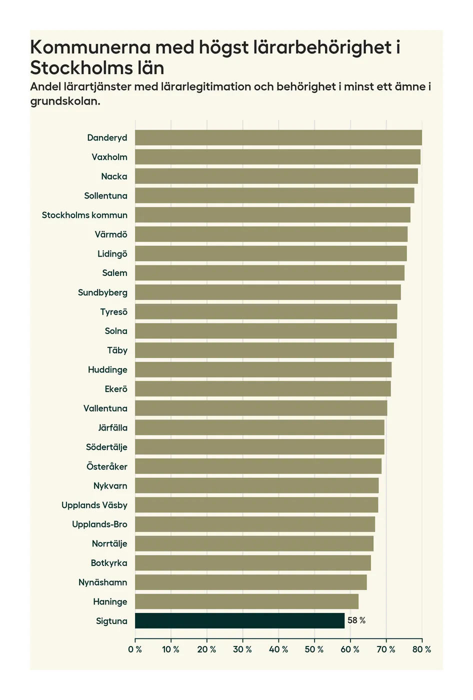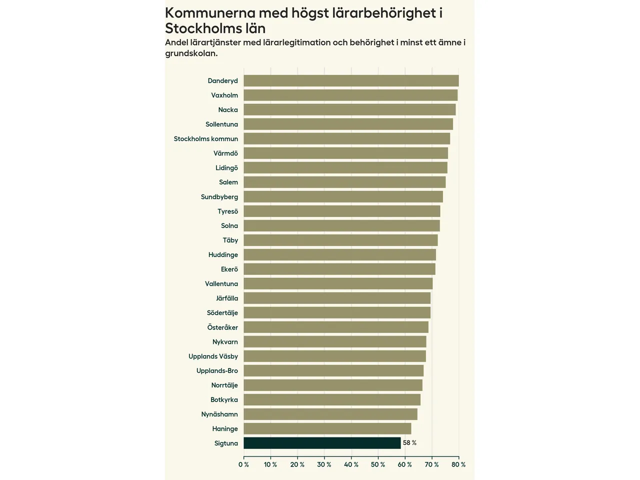 I oktober 2023 hade motsvarande 58 procent av lärarna1 i grundskolan i Sigtuna kommun lärarlegitimation och behörighet i minst ett ämne. Det innebär att kommunen har den lägsta lärarbehörigheten i Stockholms län.