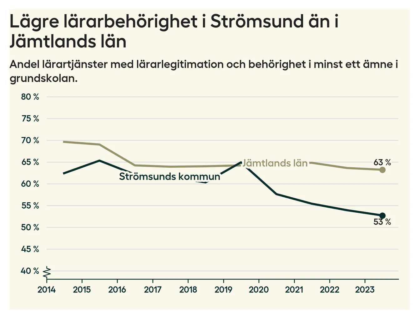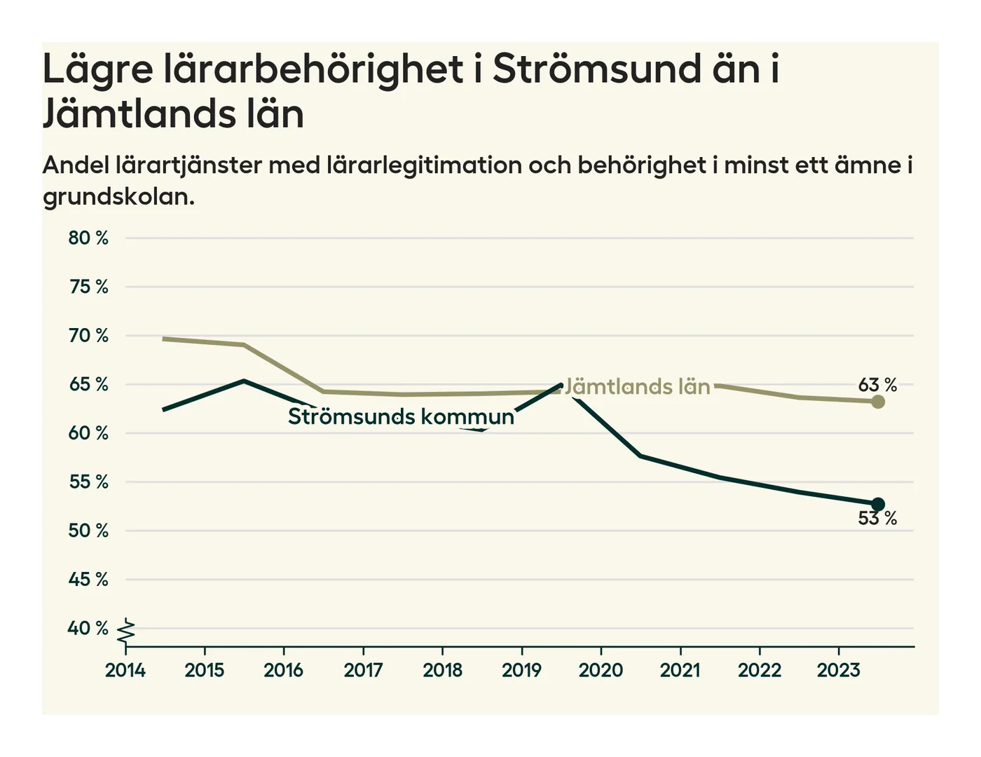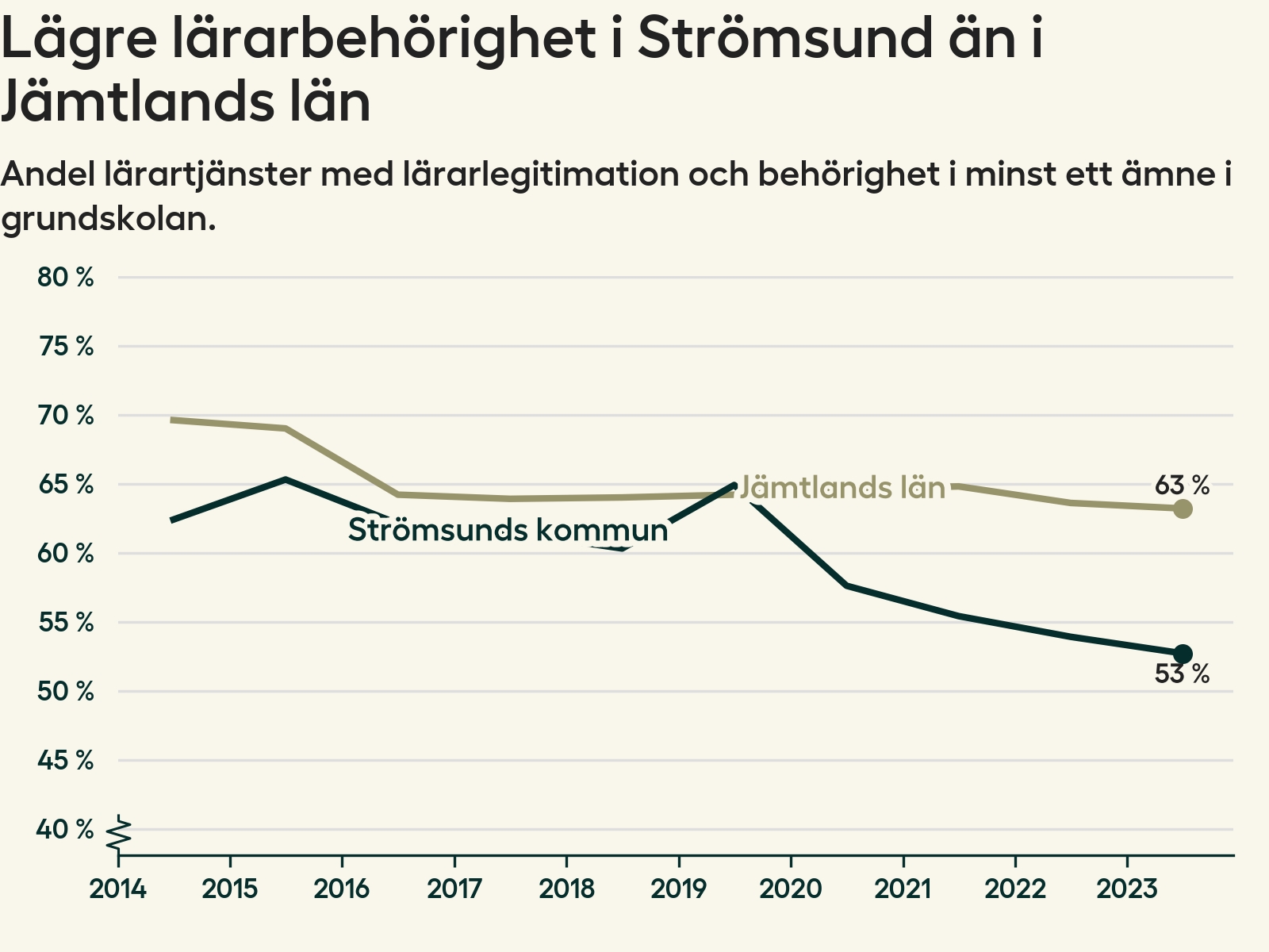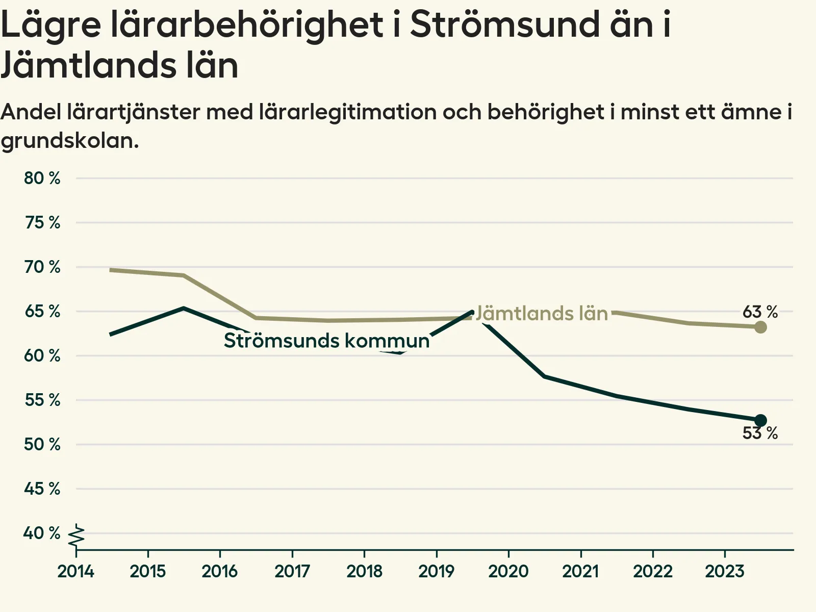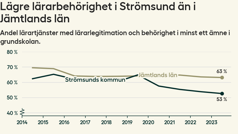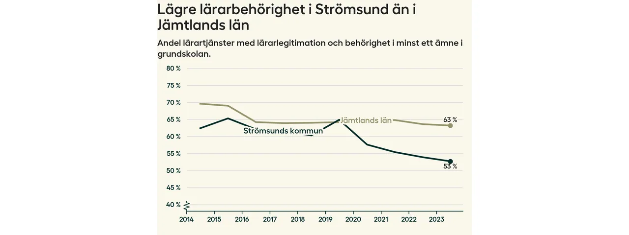 I oktober 2023 hade motsvarande 53 procent av lärarna1 i grundskolan i Strömsunds kommun lärarlegitimation och behörighet i minst ett ämne. Det är en minskning med en procentenhet jämfört med året innan och den lägsta nivån som noterats sedan 2014.
