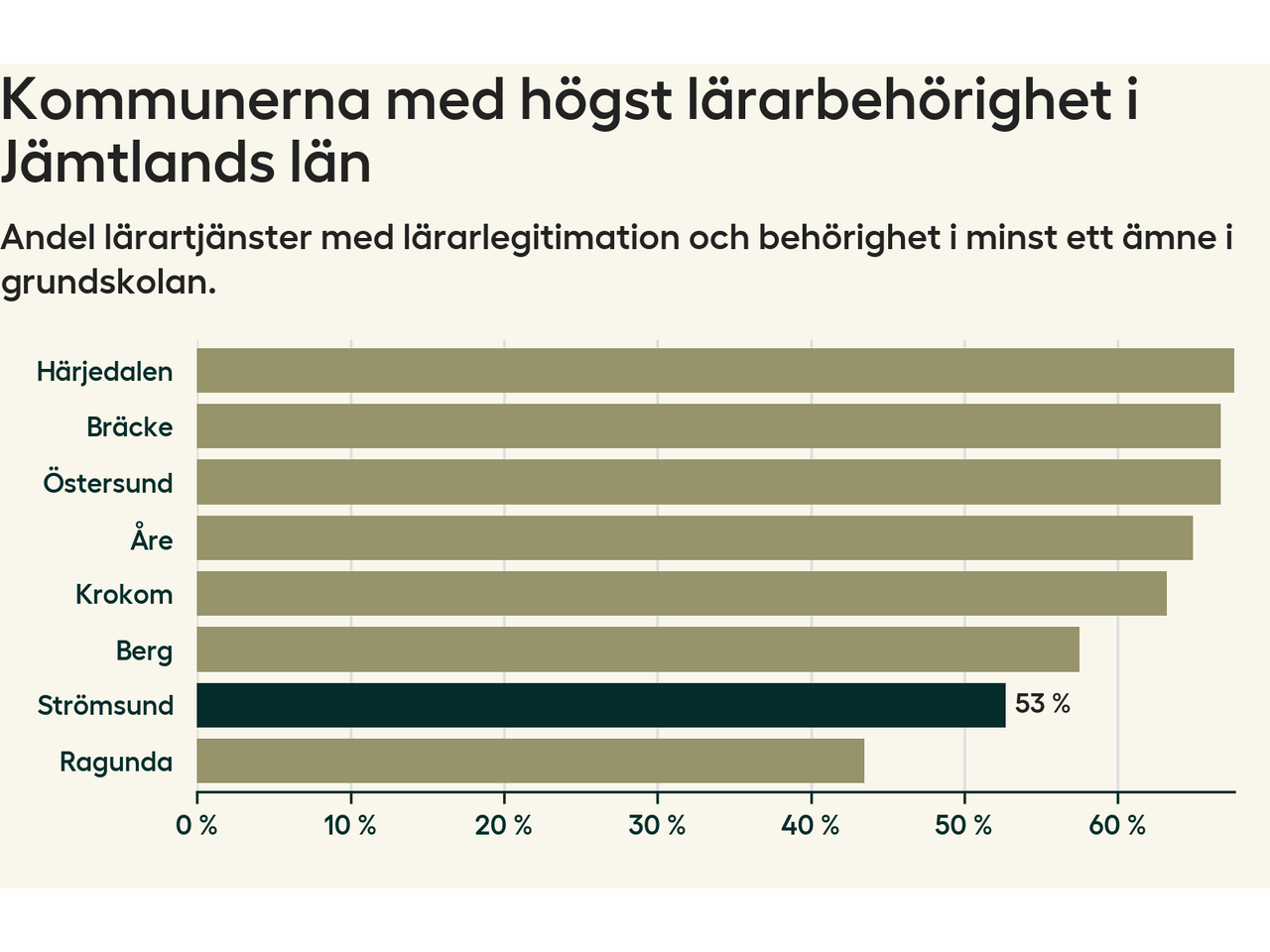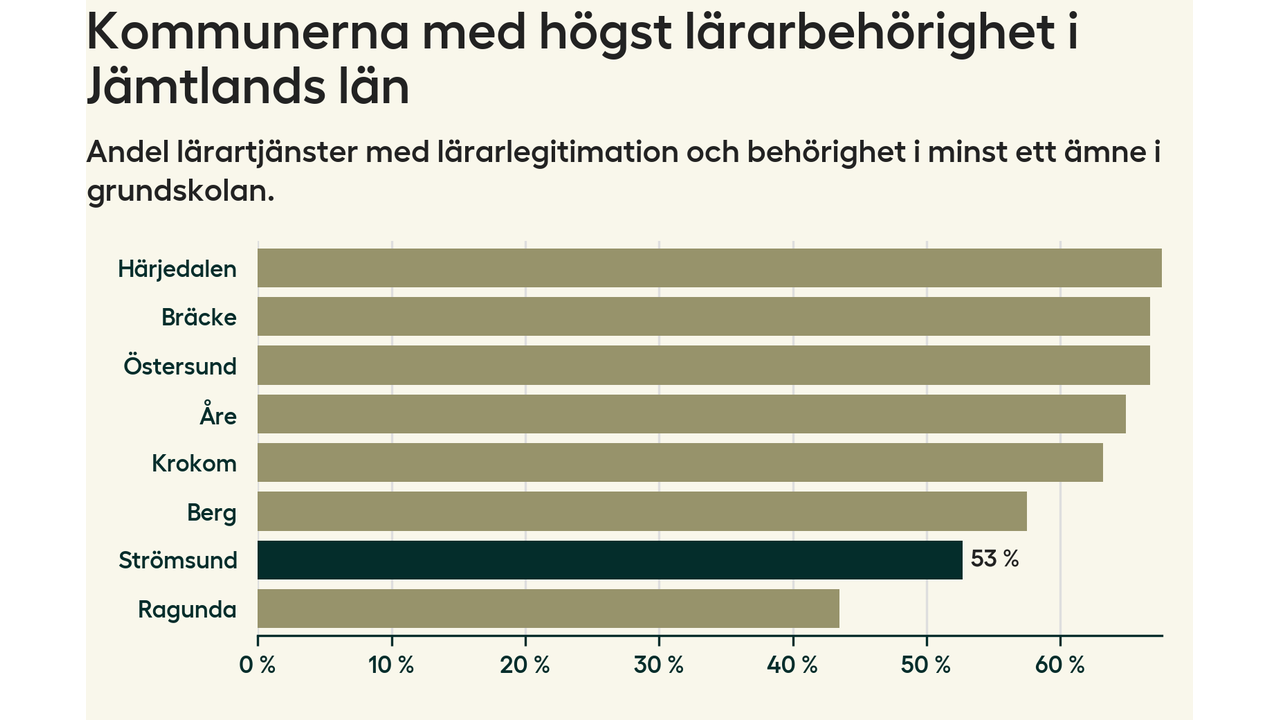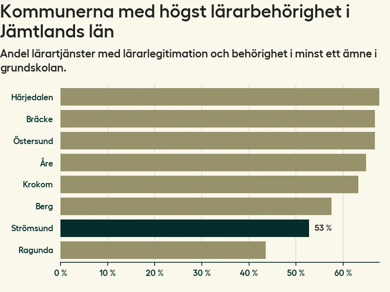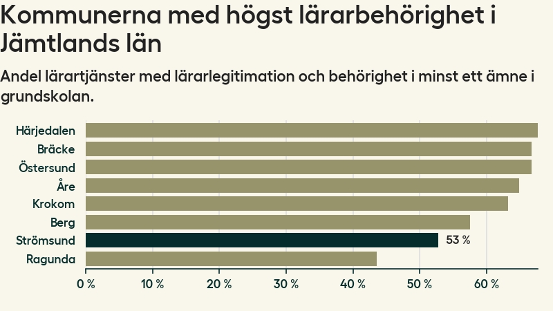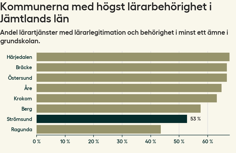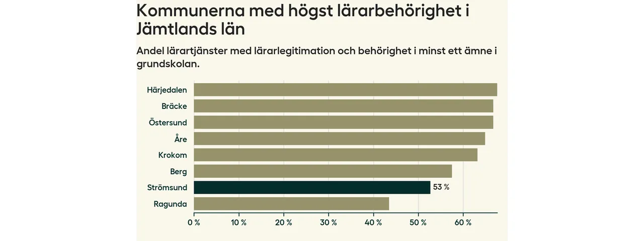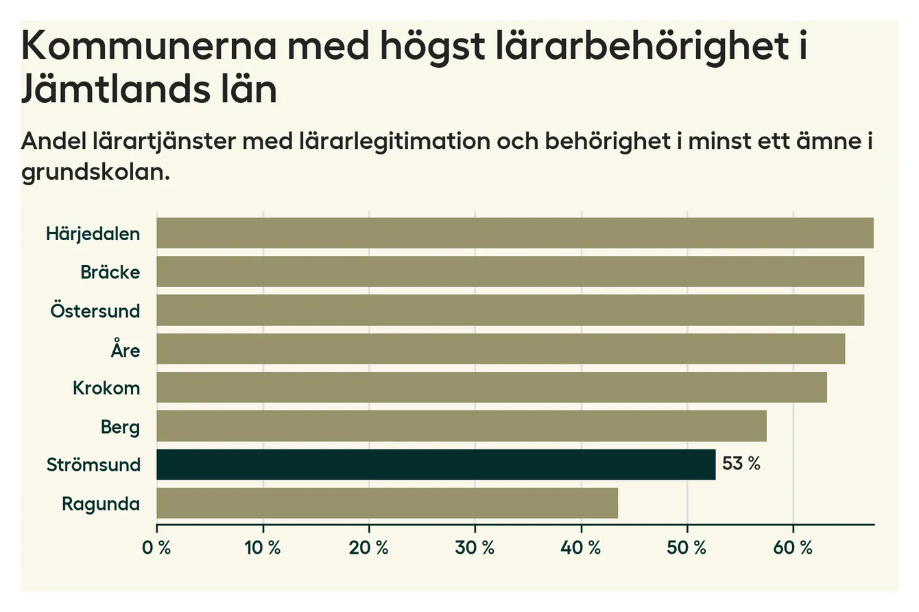 Av de sammanlagt 99 heltidstjänsterna i grundskolan i Strömsunds kommun (motsvarande 115 lärare) var det 52 som hade lärarlegitimation och behörighet i minst ett ämne.