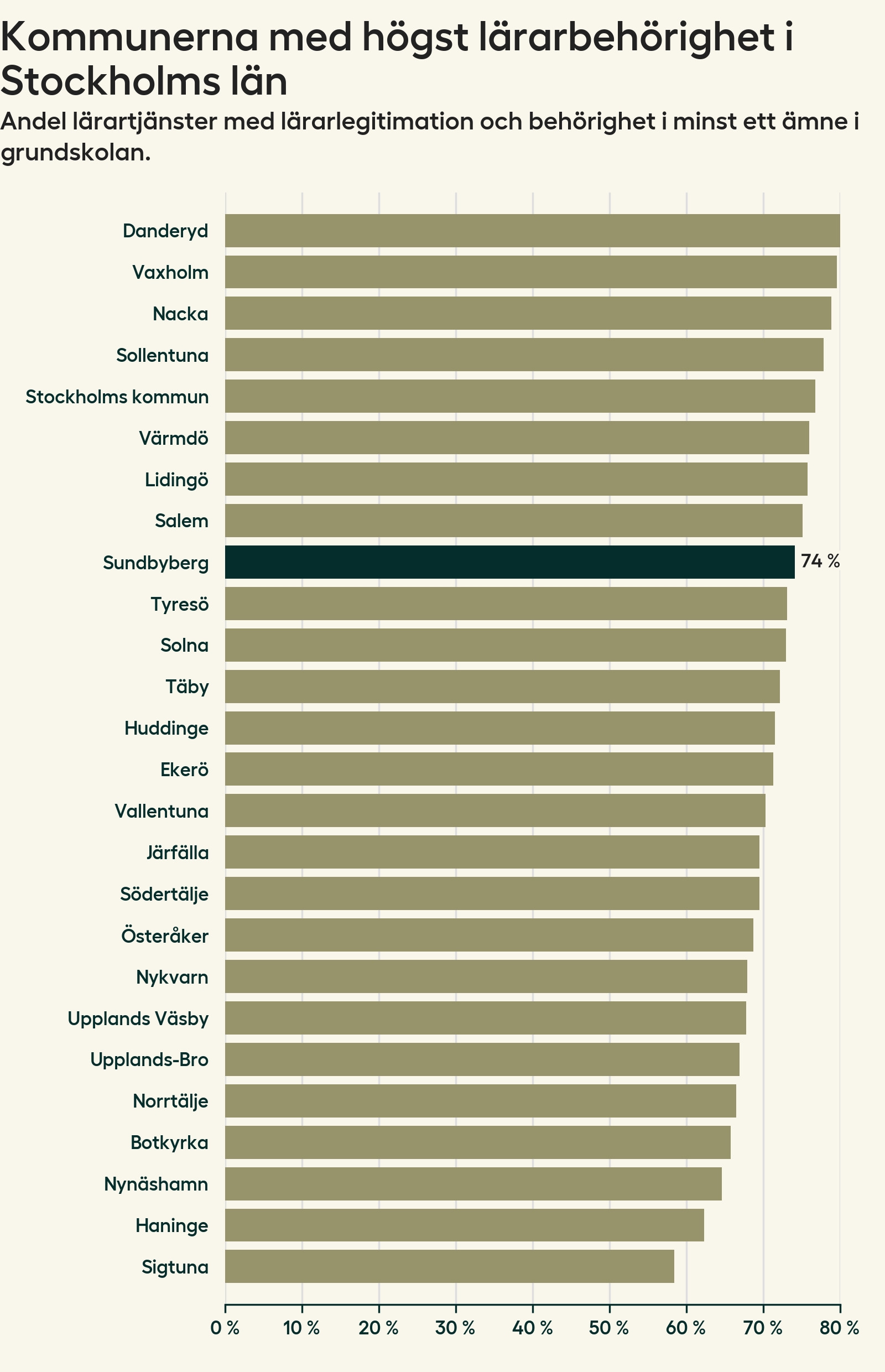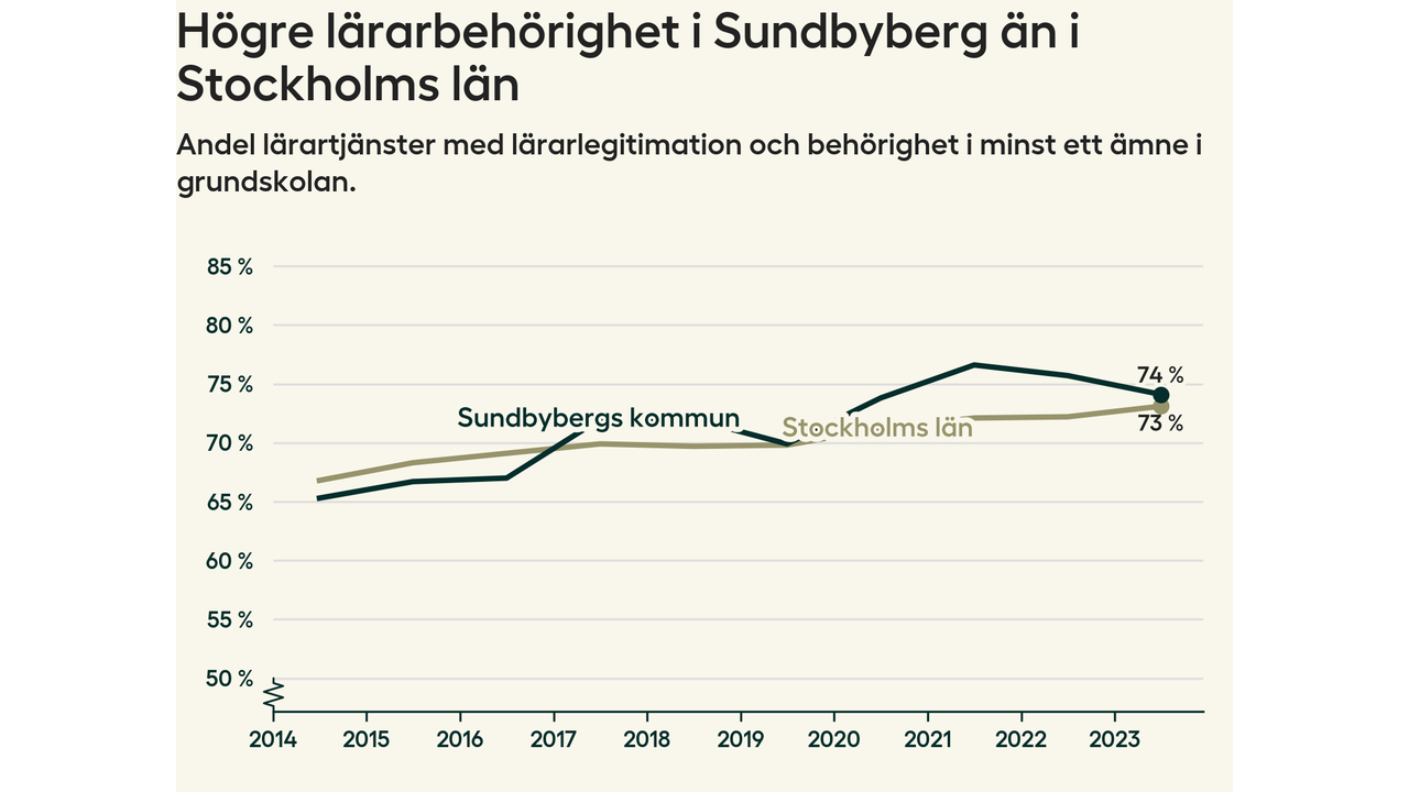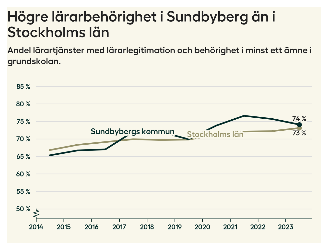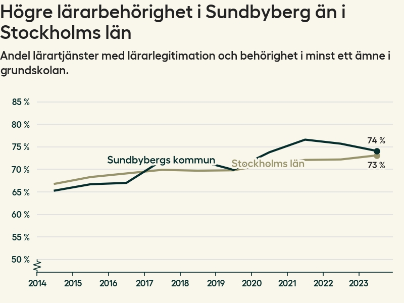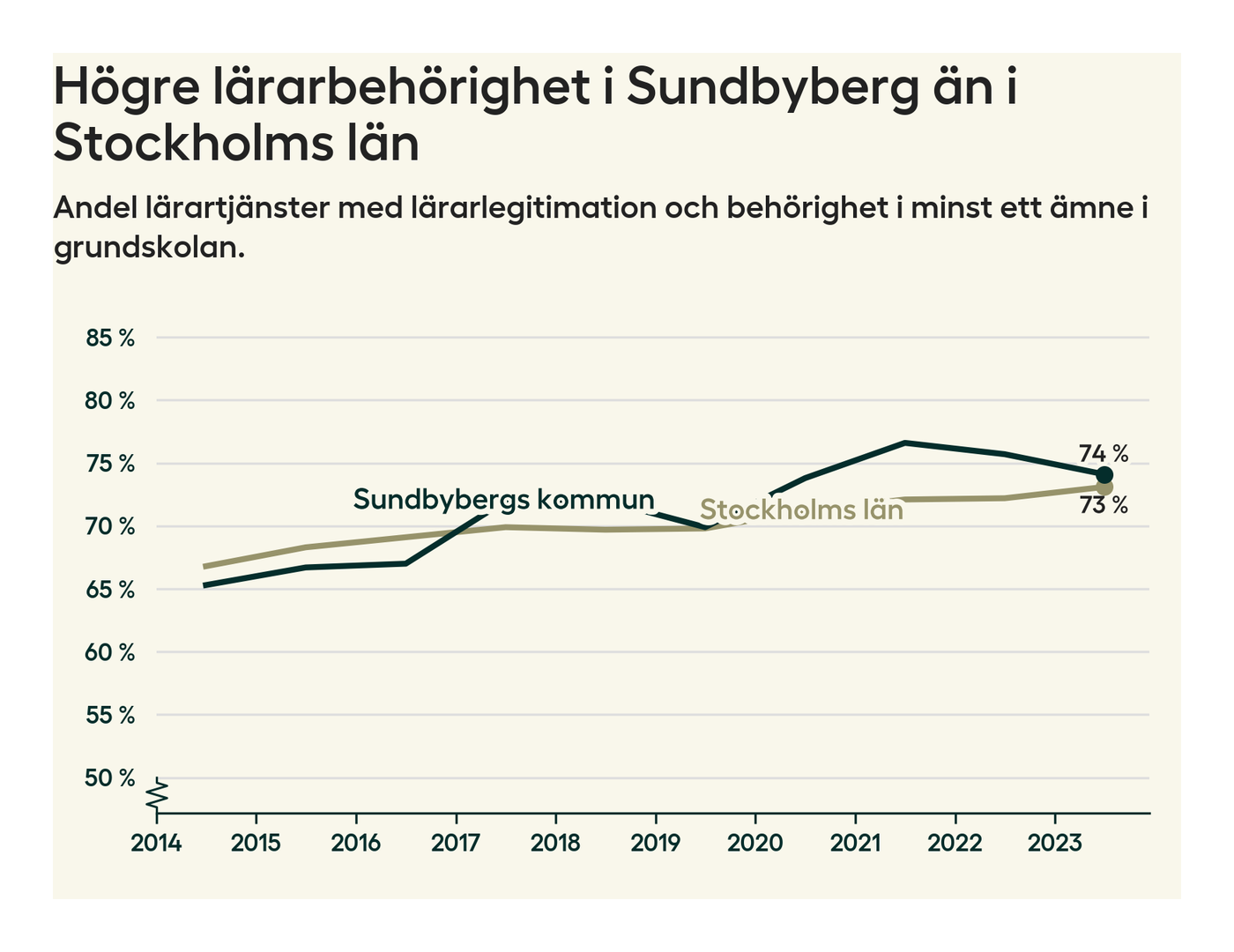 I oktober 2023 hade motsvarande 74 procent av lärarna1 i grundskolan i Sundbybergs kommun lärarlegitimation och behörighet i minst ett ämne.