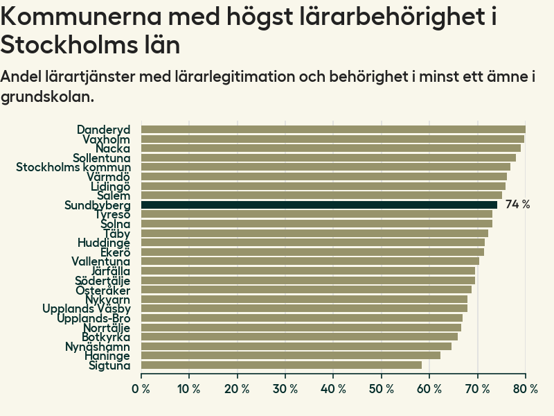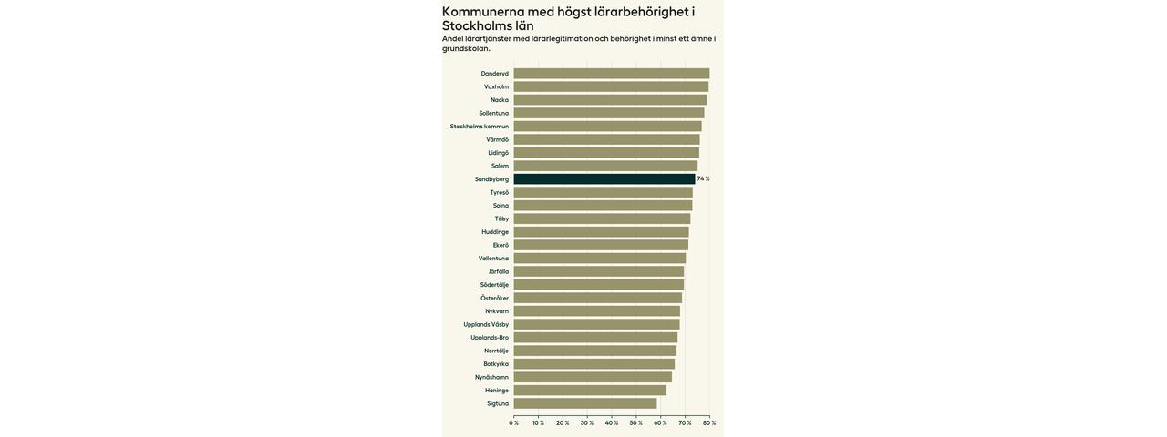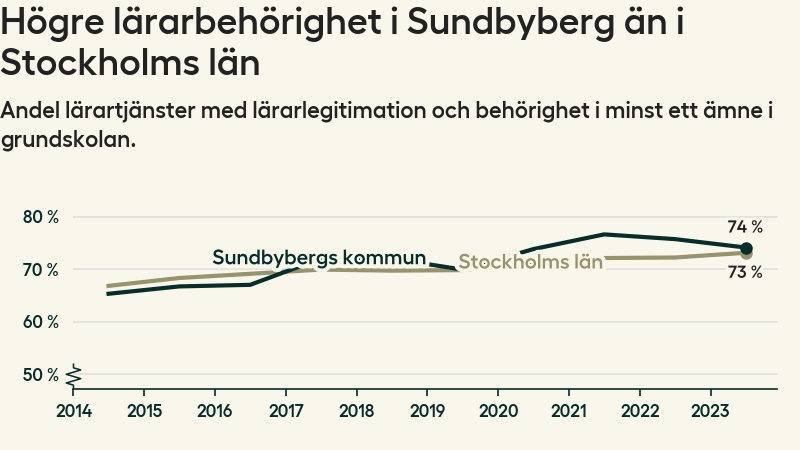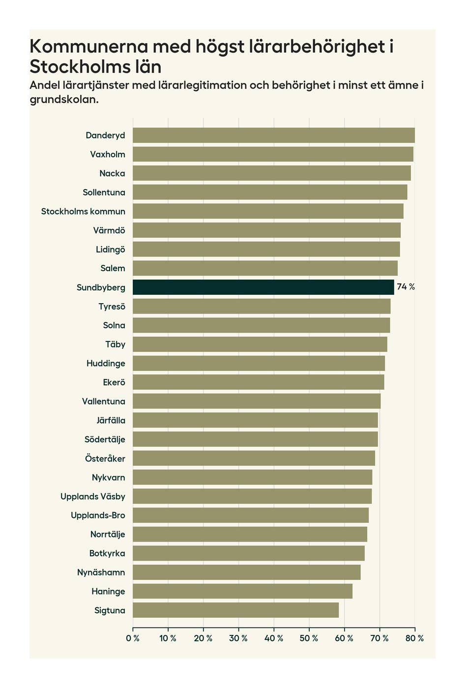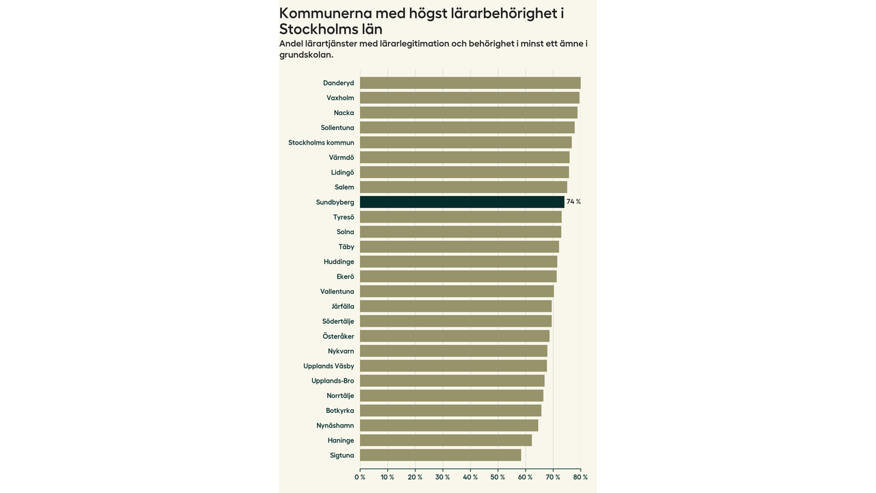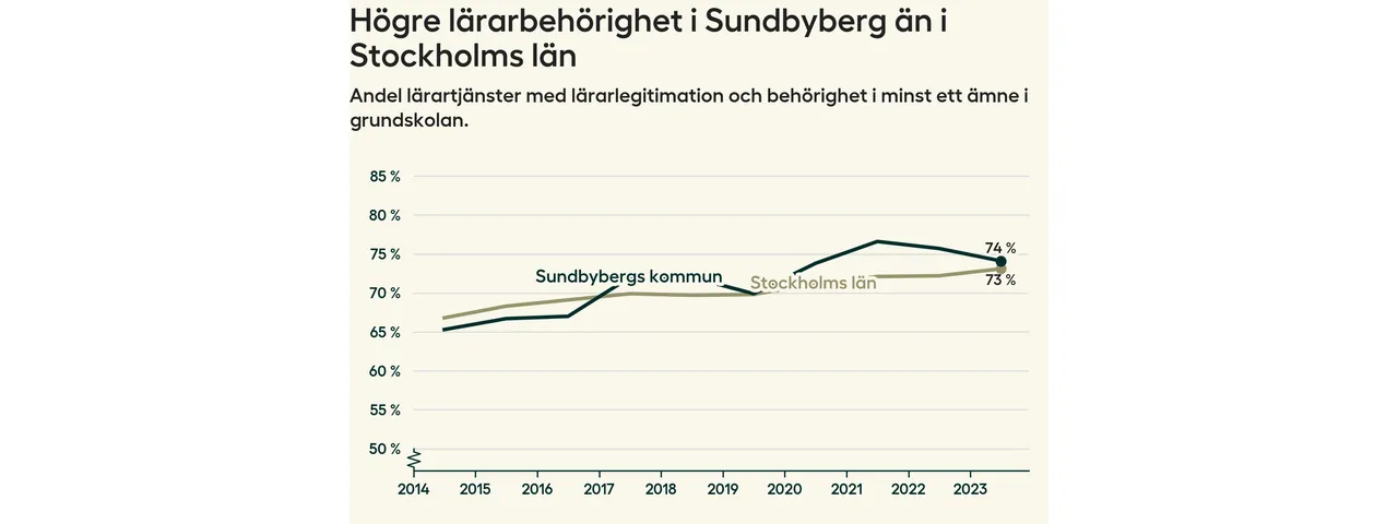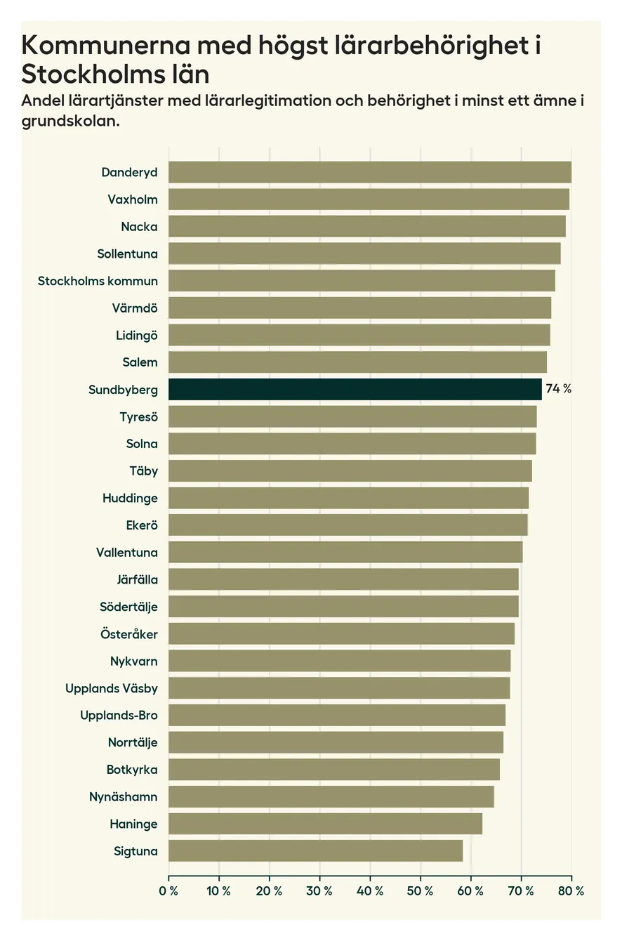 I oktober 2023 hade motsvarande 74 procent av lärarna1 i grundskolan i Sundbybergs kommun lärarlegitimation och behörighet i minst ett ämne.