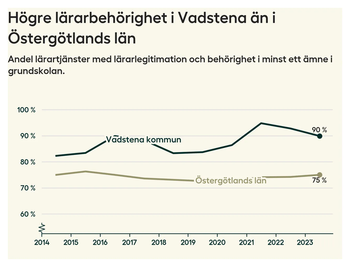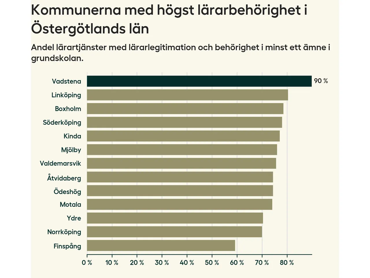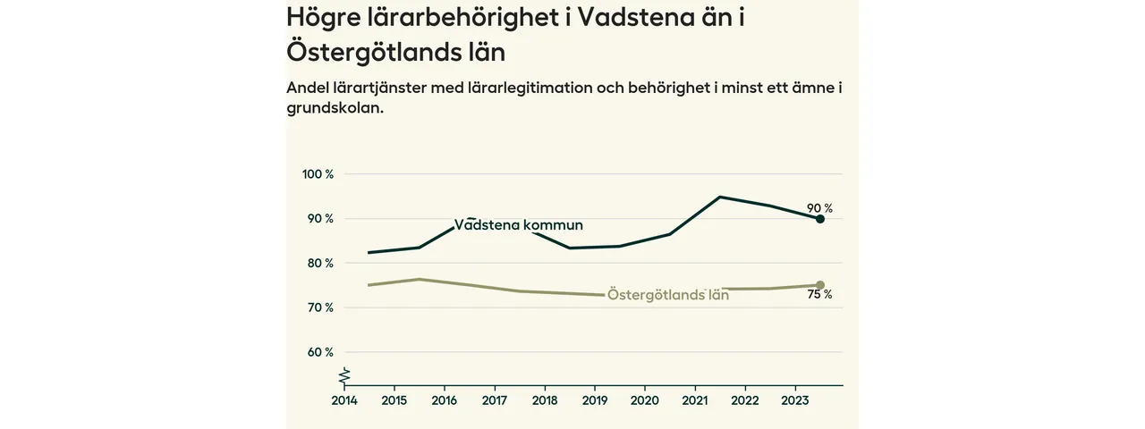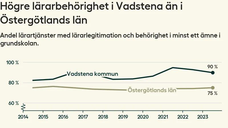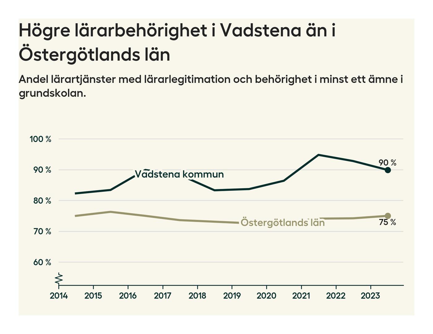 I oktober 2023 hade motsvarande 90 procent av lärarna1 i grundskolan i Vadstena kommun lärarlegitimation och behörighet i minst ett ämne. Det innebär att kommunen har den högsta lärarbehörigheten i hela landet.