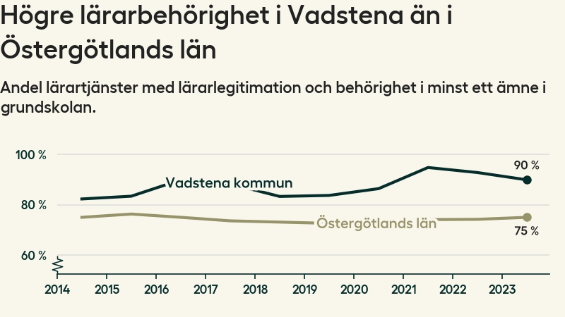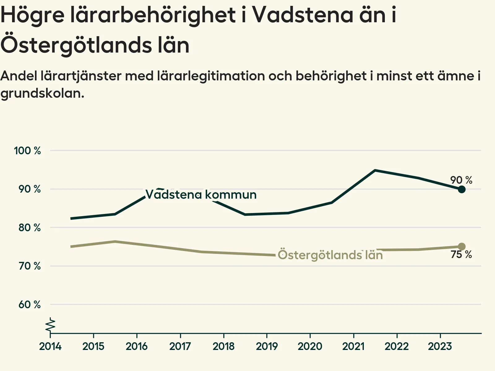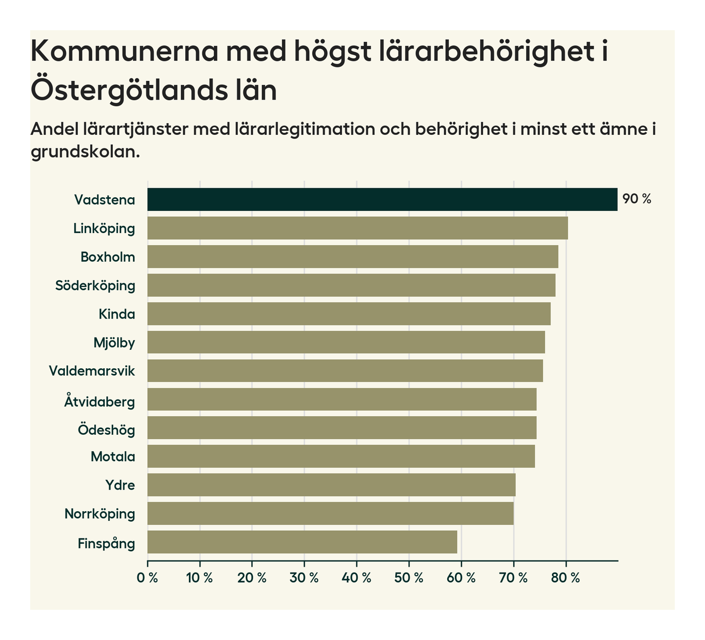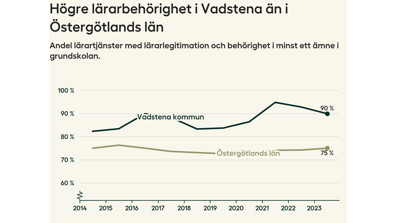 I oktober 2023 hade motsvarande 90 procent av lärarna1 i grundskolan i Vadstena kommun lärarlegitimation och behörighet i minst ett ämne. Det innebär att kommunen har den högsta lärarbehörigheten i hela landet.