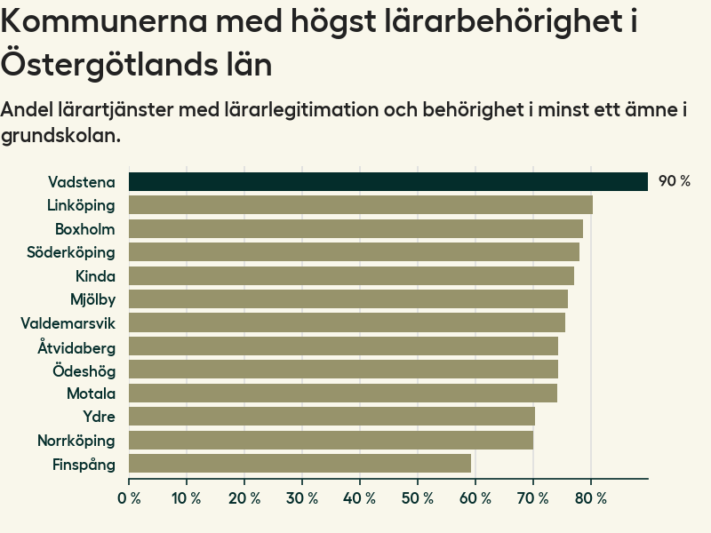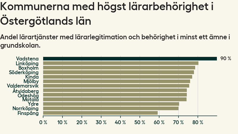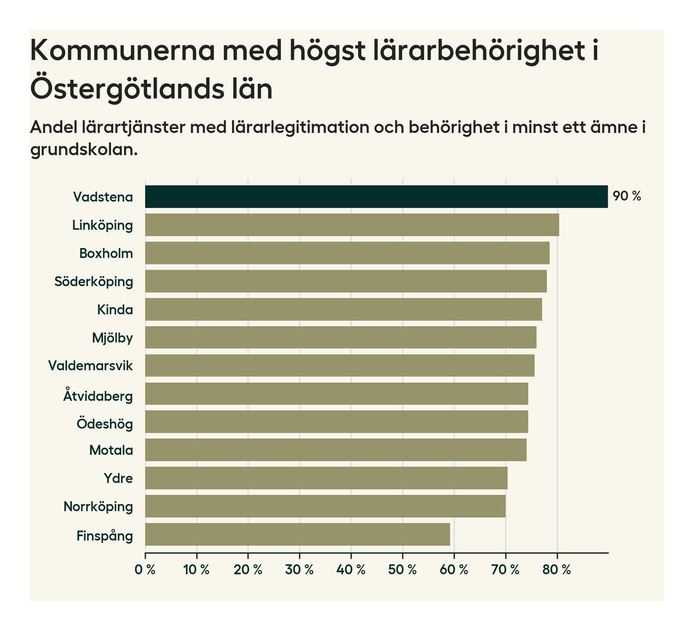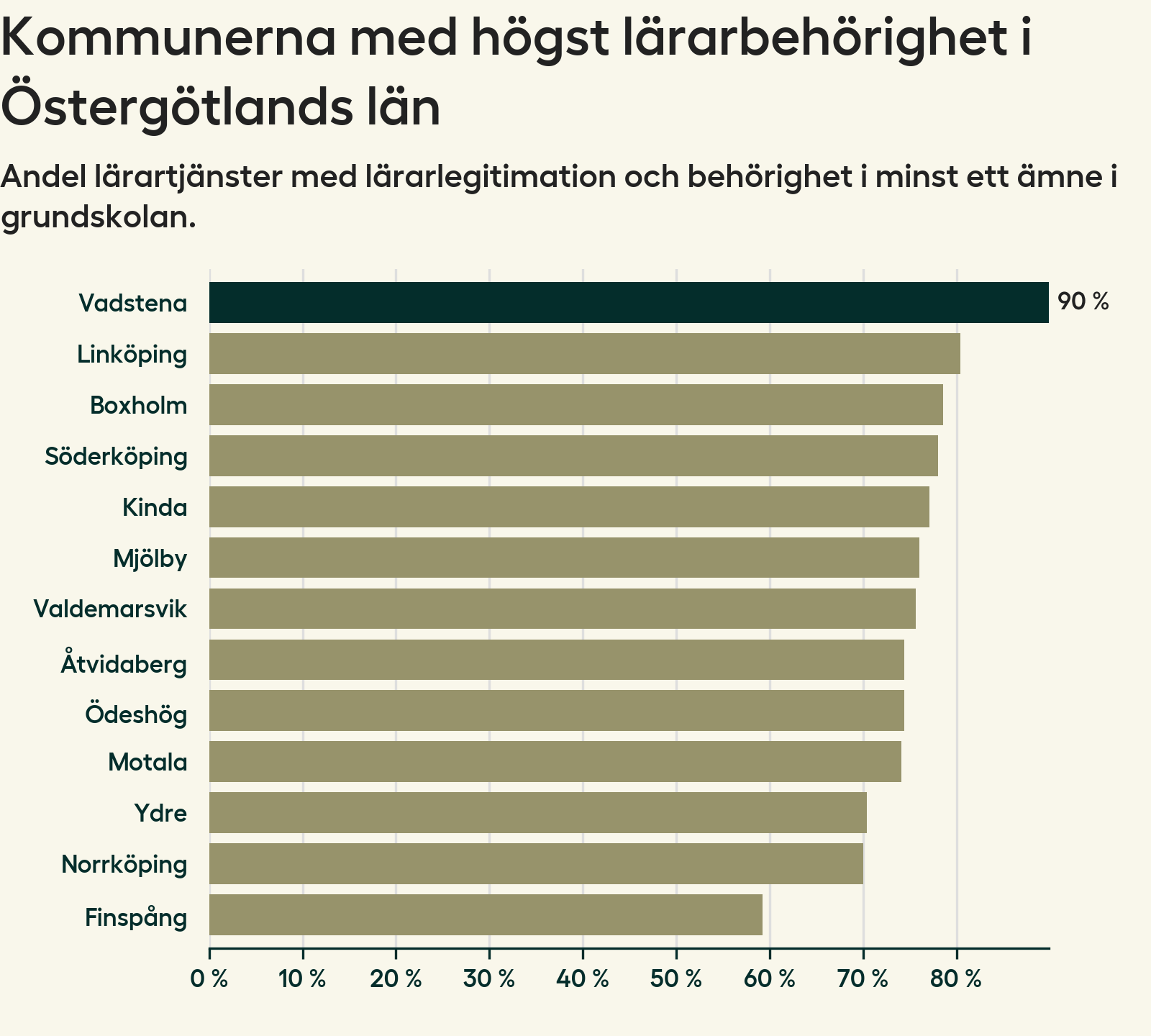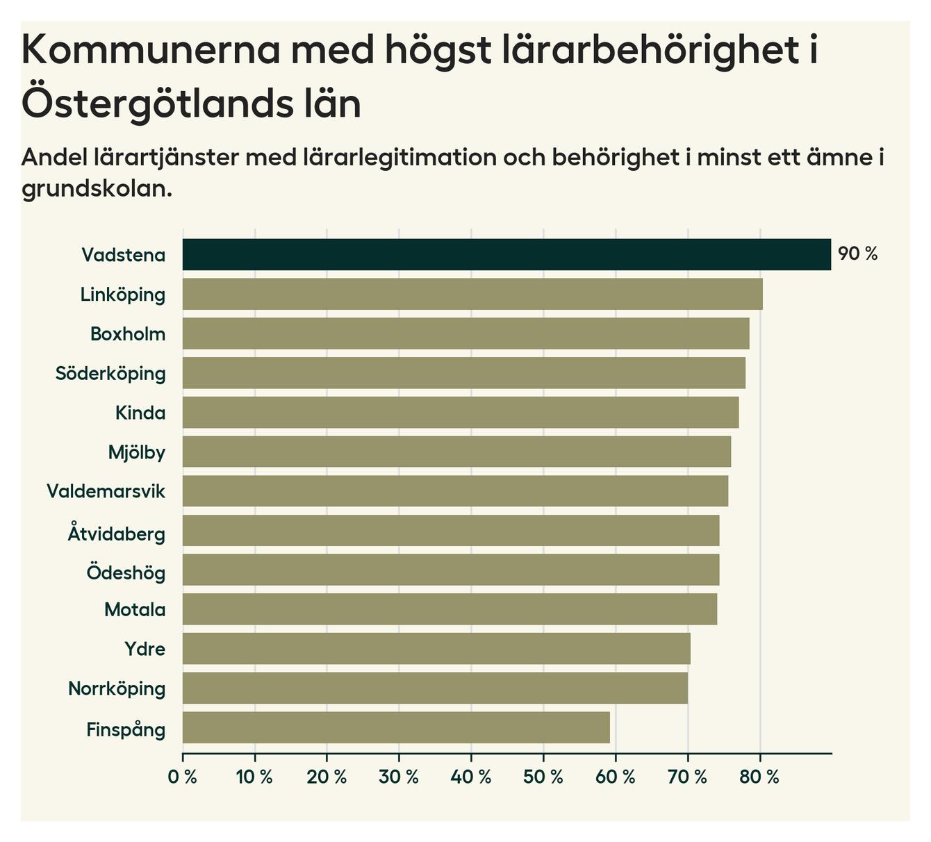 I oktober 2023 hade motsvarande 90 procent av lärarna1 i grundskolan i Vadstena kommun lärarlegitimation och behörighet i minst ett ämne. Det innebär att kommunen har den högsta lärarbehörigheten i hela landet.