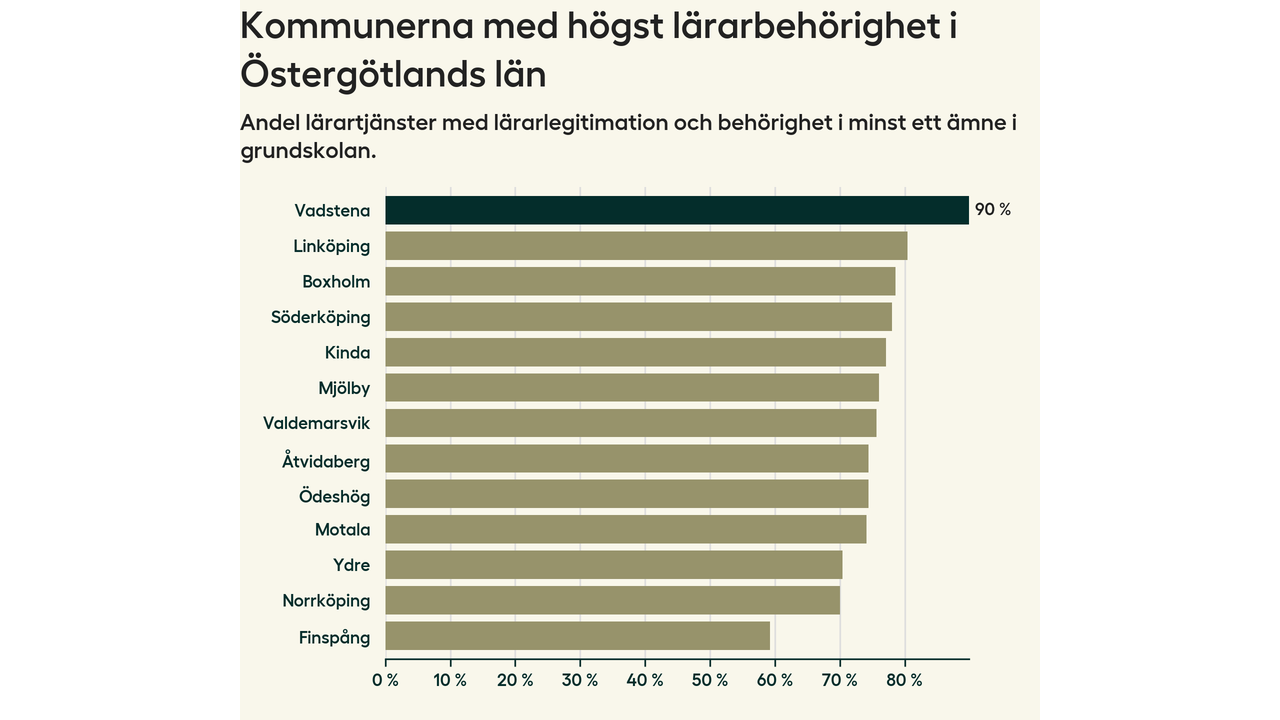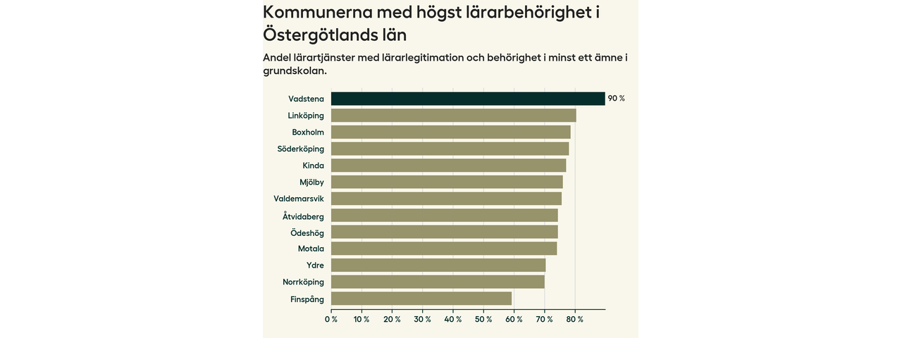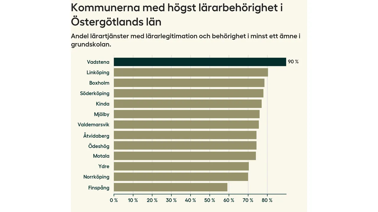 Lärarbehörigheten ökar med minst en procentenhet i sammanlagt fyra av 13 kommuner i Östergötlands län. Mest anmärkningsvärda förbättringar ser vi i Boxholm och Valdemarsvik.
