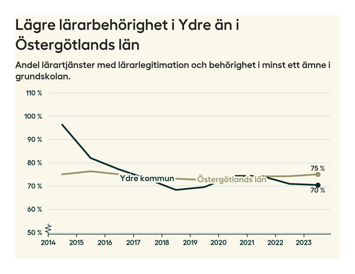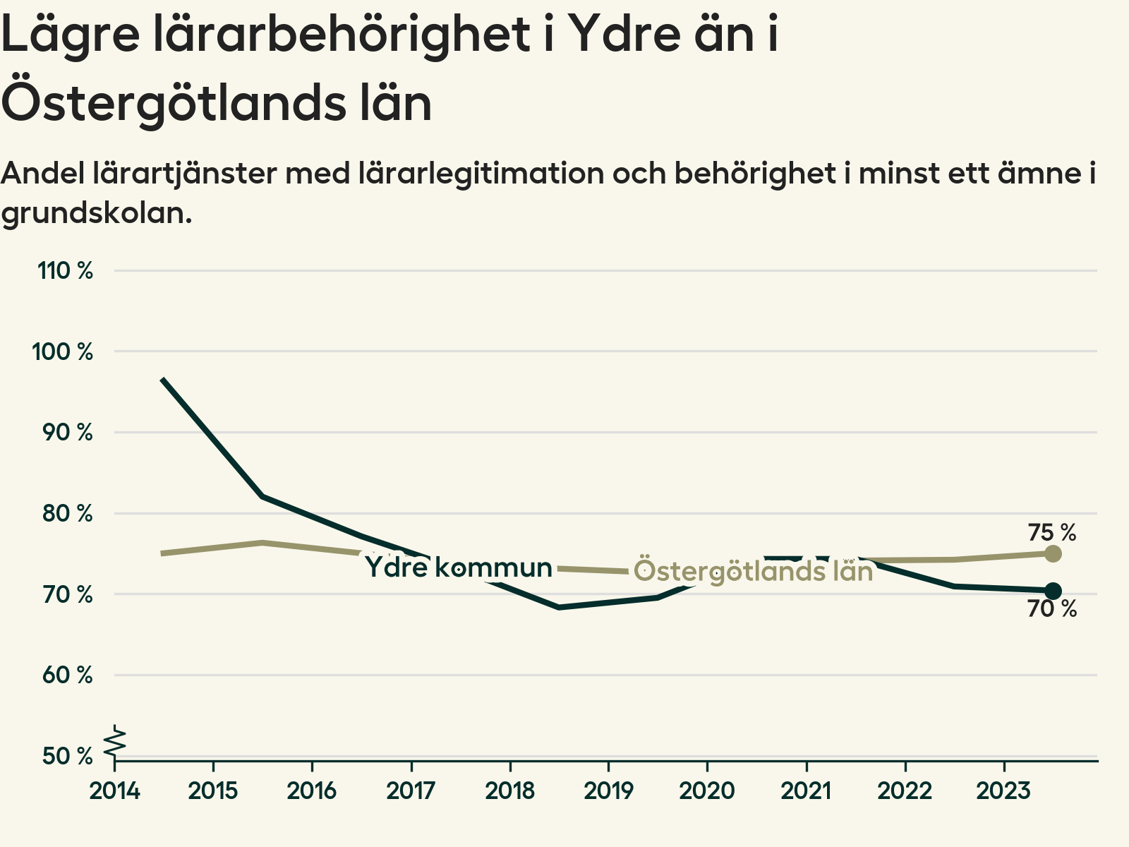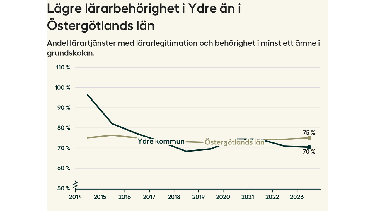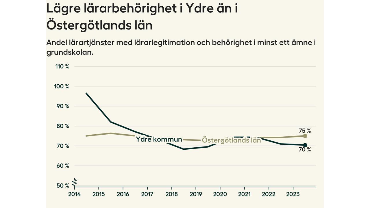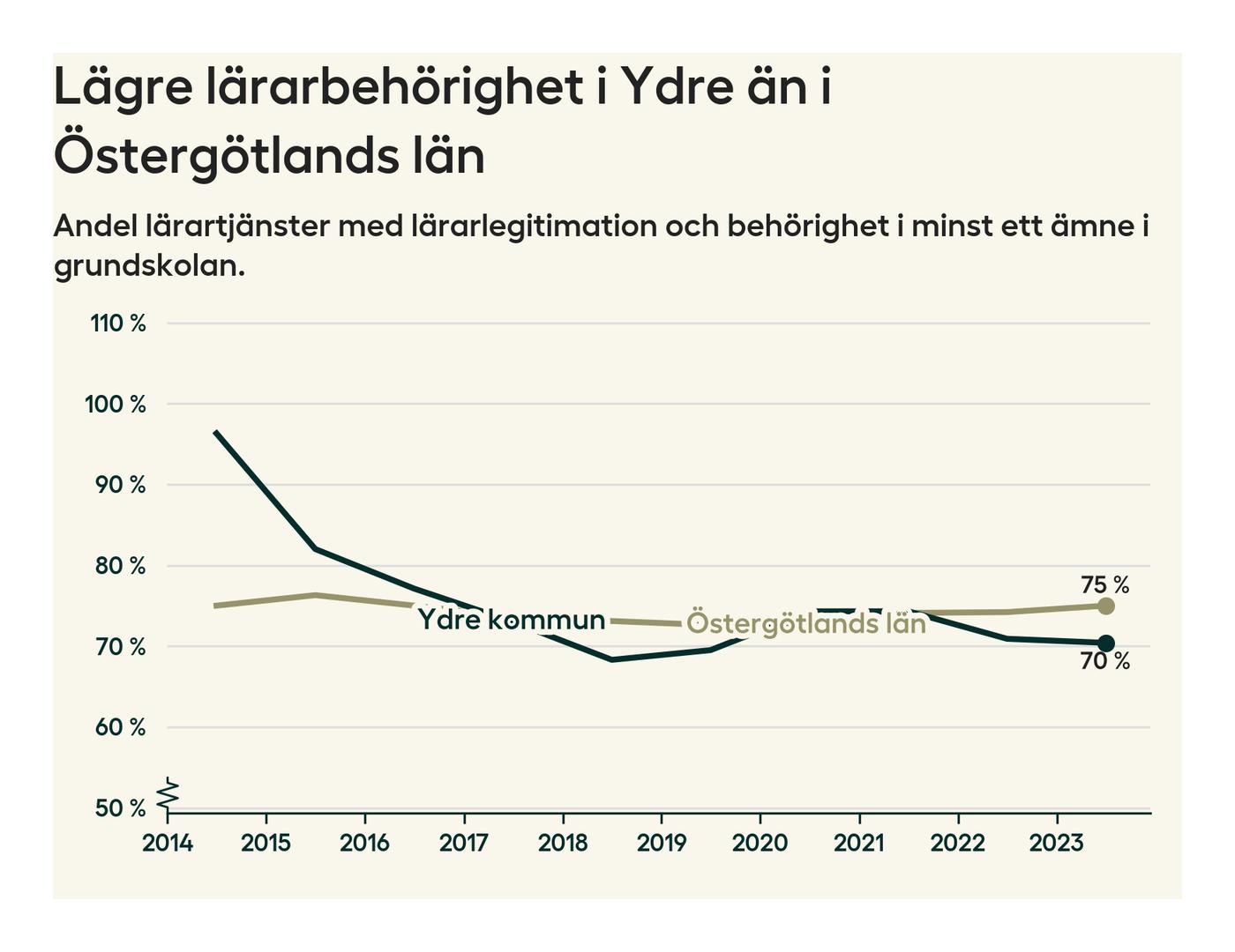 I oktober 2023 hade motsvarande 70 procent av lärarna1 i grundskolan i Ydre kommun lärarlegitimation och behörighet i minst ett ämne.