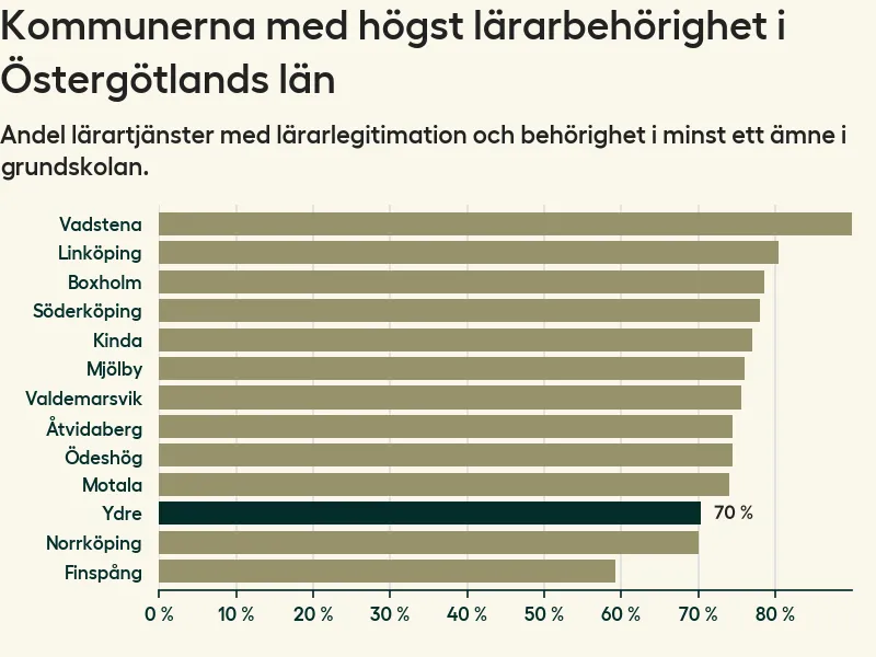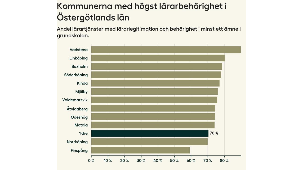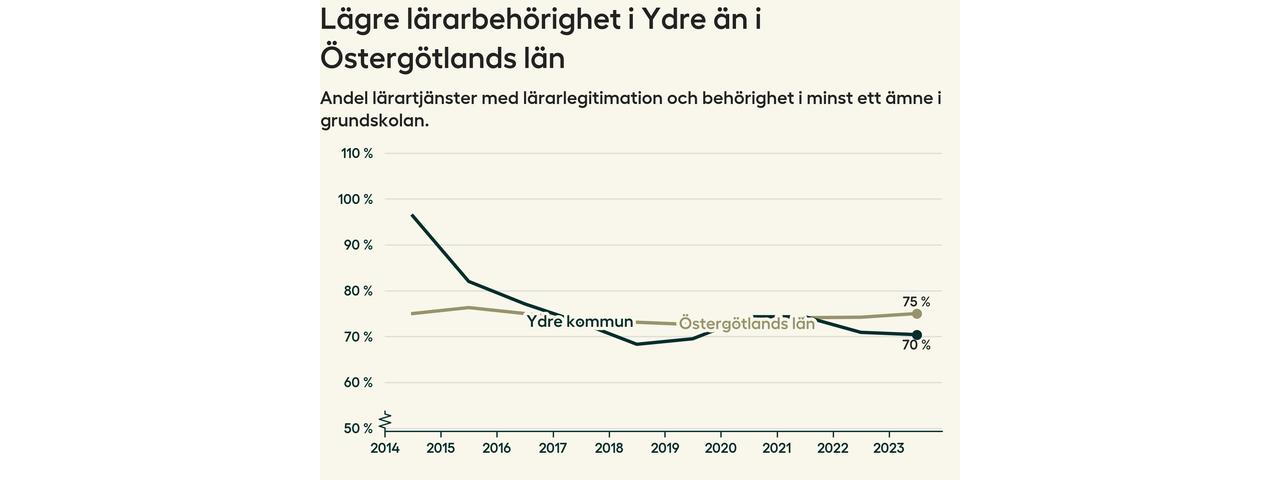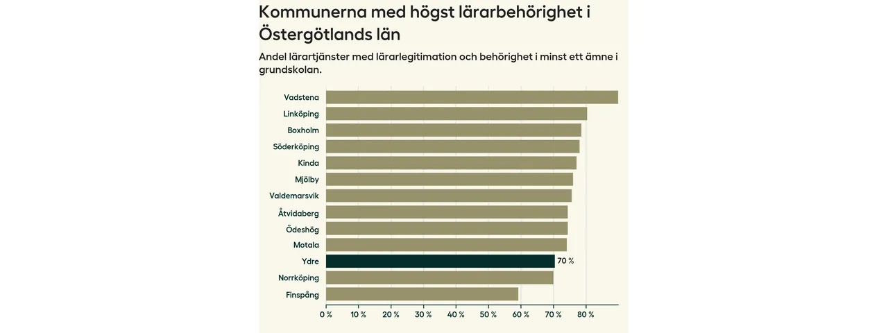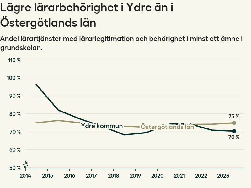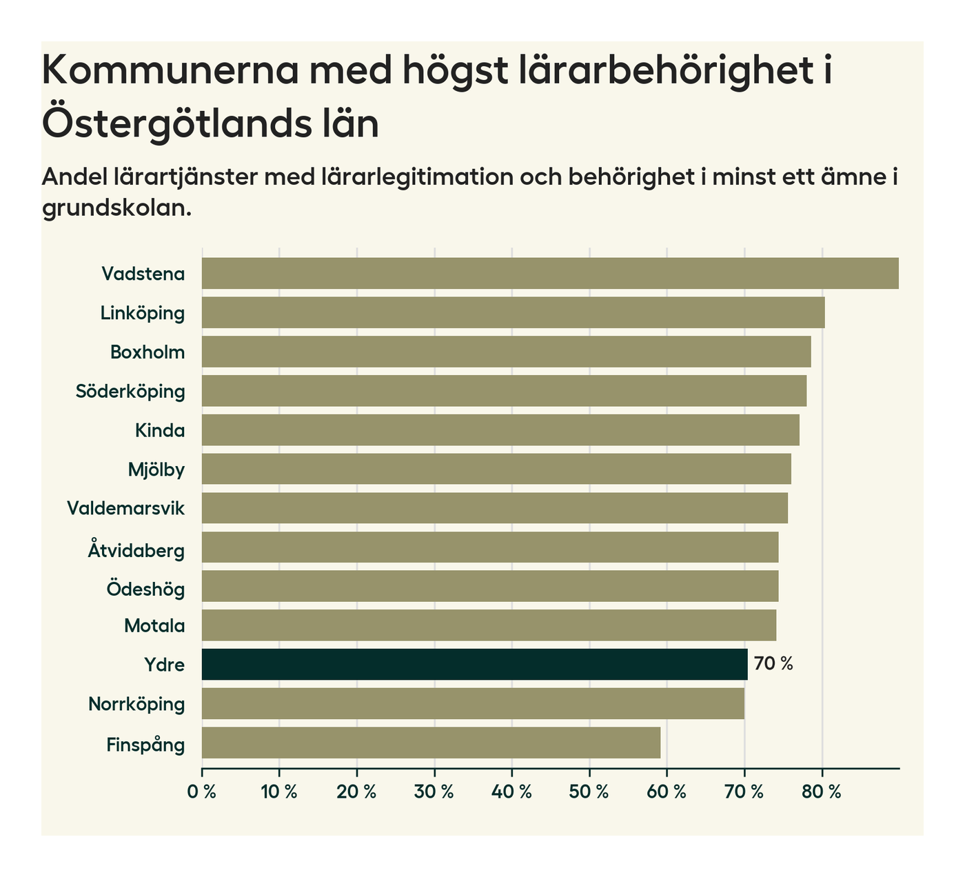 I oktober 2023 hade motsvarande 70 procent av lärarna1 i grundskolan i Ydre kommun lärarlegitimation och behörighet i minst ett ämne.