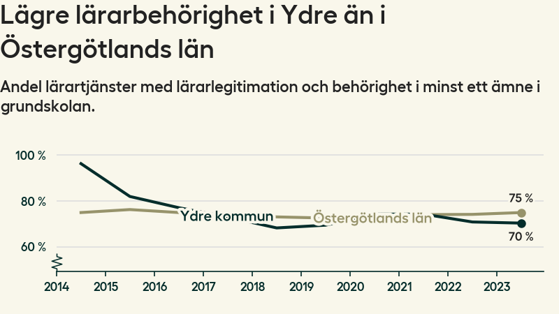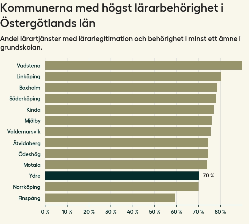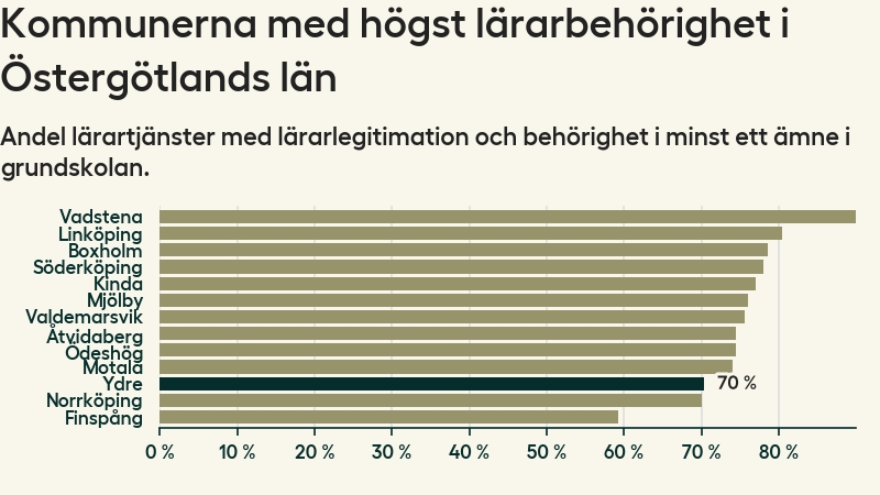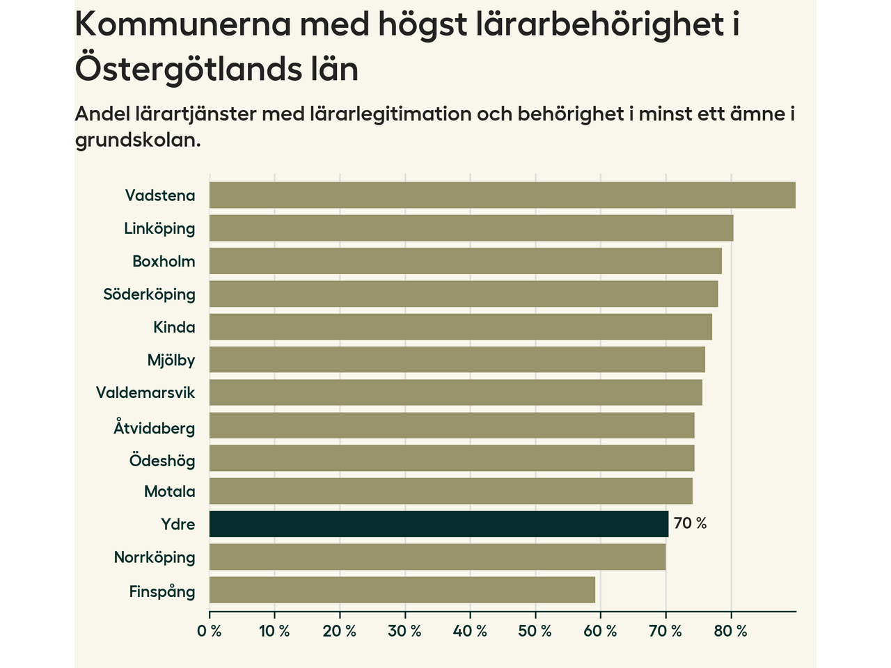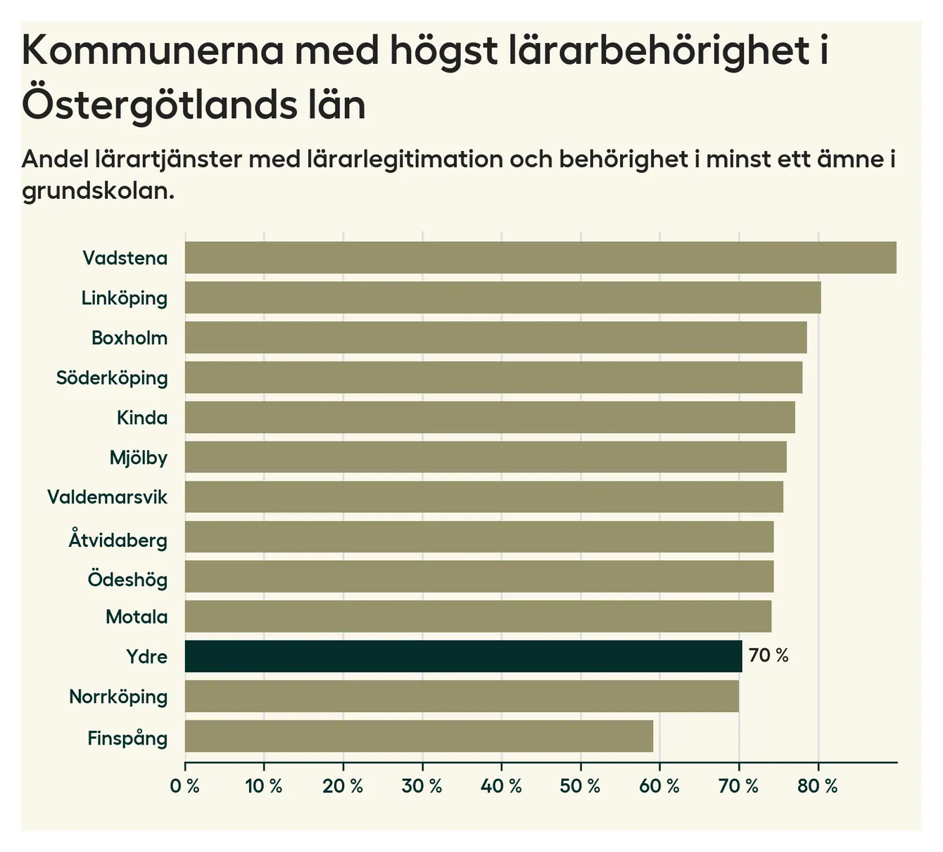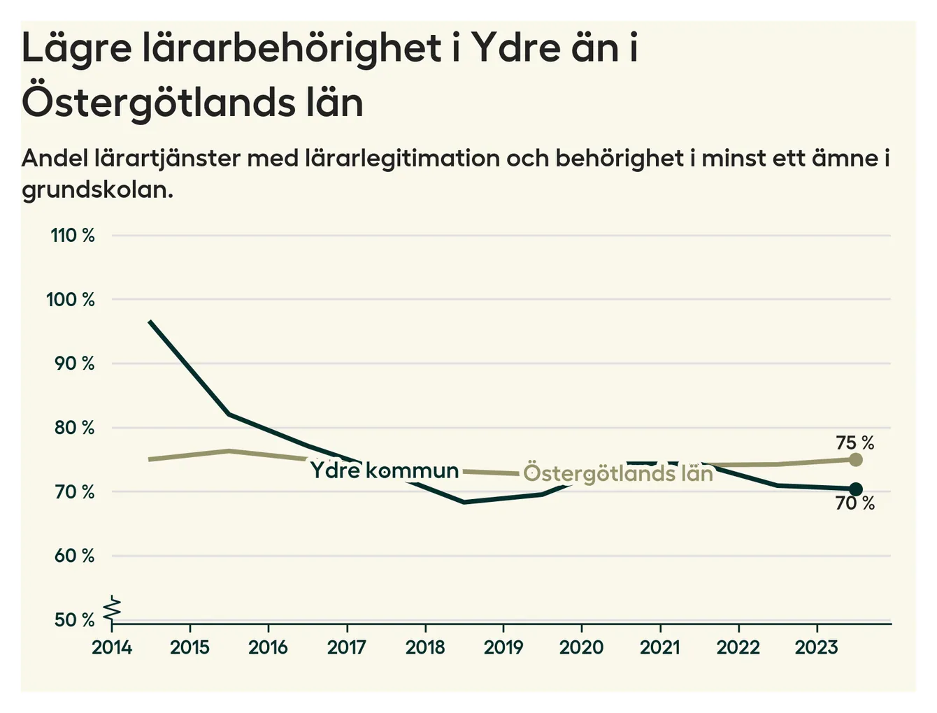 I oktober 2023 hade motsvarande 70 procent av lärarna1 i grundskolan i Ydre kommun lärarlegitimation och behörighet i minst ett ämne.