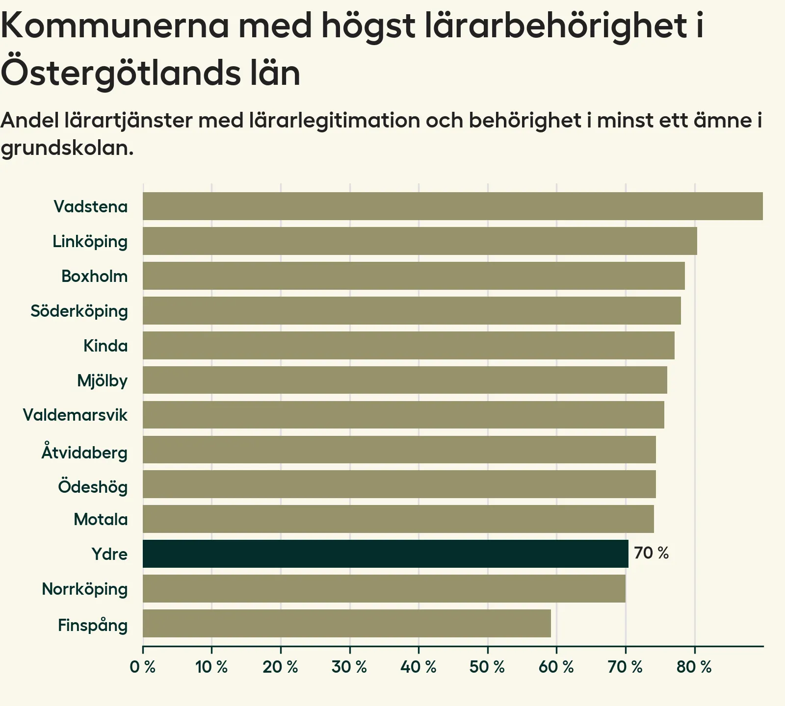 Lärarbehörigheten ökar med minst en procentenhet i sammanlagt fyra av 13 kommuner i Östergötlands län. Mest anmärkningsvärda förbättringar ser vi i Boxholm och Valdemarsvik.